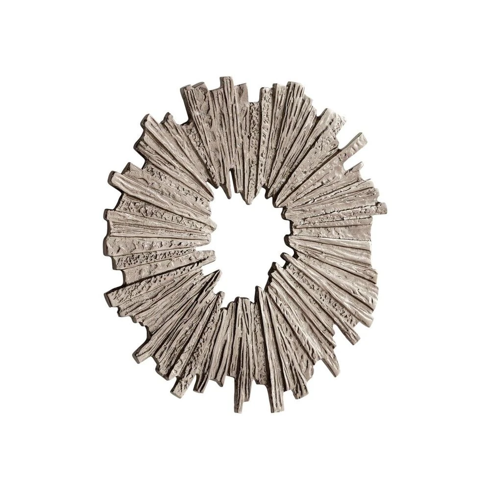 This wall decor is fashioned in a circular form with rectangular and triangular individual pieces that make up the structure. This piece also features a unique opening at the center that makes it stand out from the background.