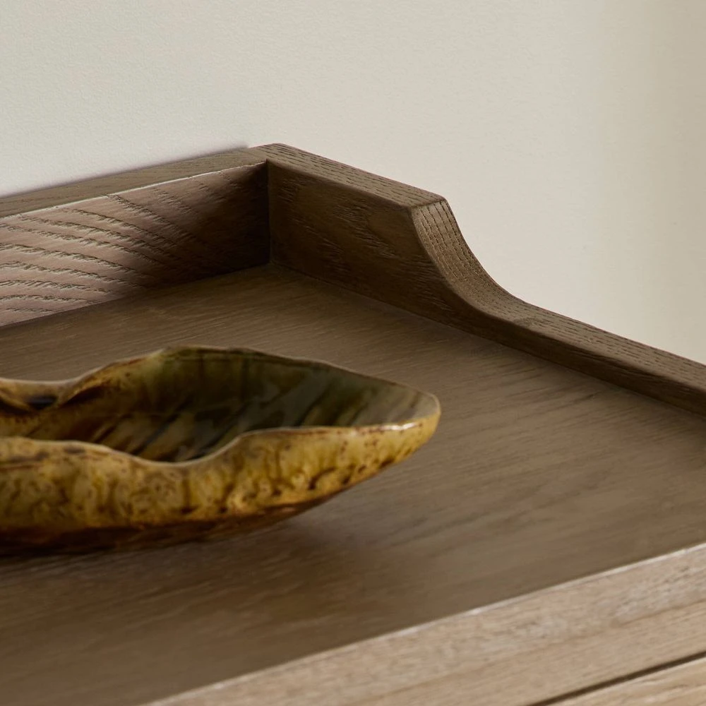 Description: The classic sideboard takes new shape with a unique gallery design on top. Doors are fixed with a functional lock. Aged bronze hardware complements a weathered washed oak finish.