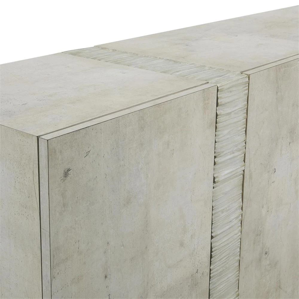 The Ether Sideboard showcases a timeless profile with subtle hints of contemporary flair. A wooden frame is adorned in a gorgeous tiza gesso finish, imbuing the piece with tasteful neutral tones. The piece sits atop two steel legs exhibiting a stylish striated pattern in a chalked silver leaf finish, wrapped around the entirety of the body while sitting flush with the tabletop to complete the look.