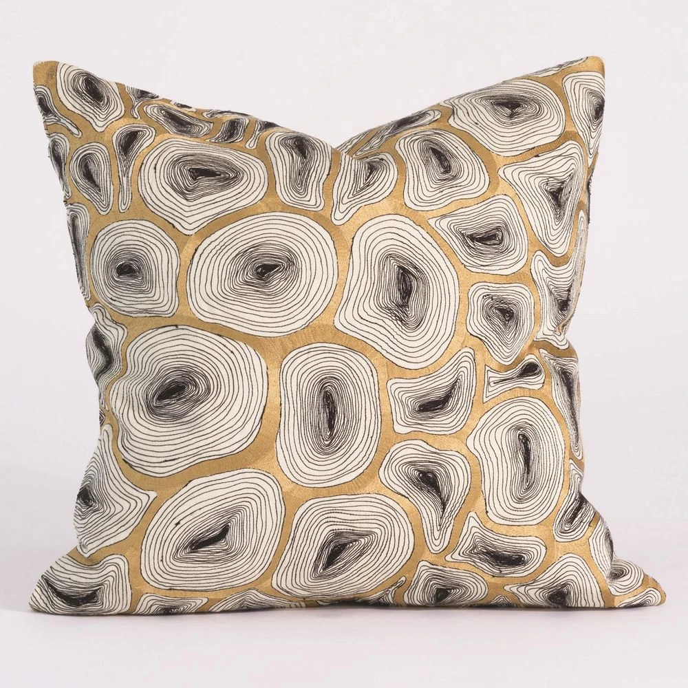 Description: Dense gold with black hand-embroidery in a one-dimensional agate motif.