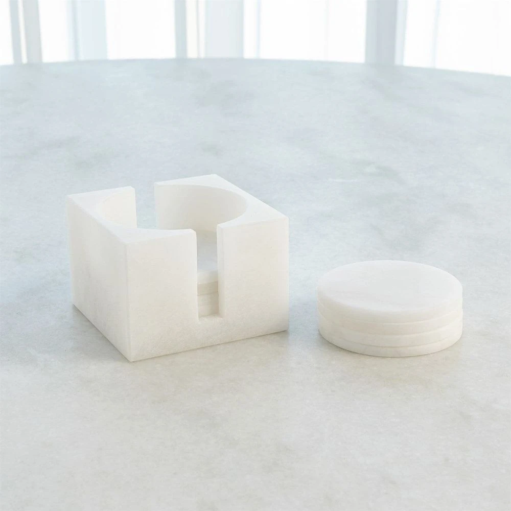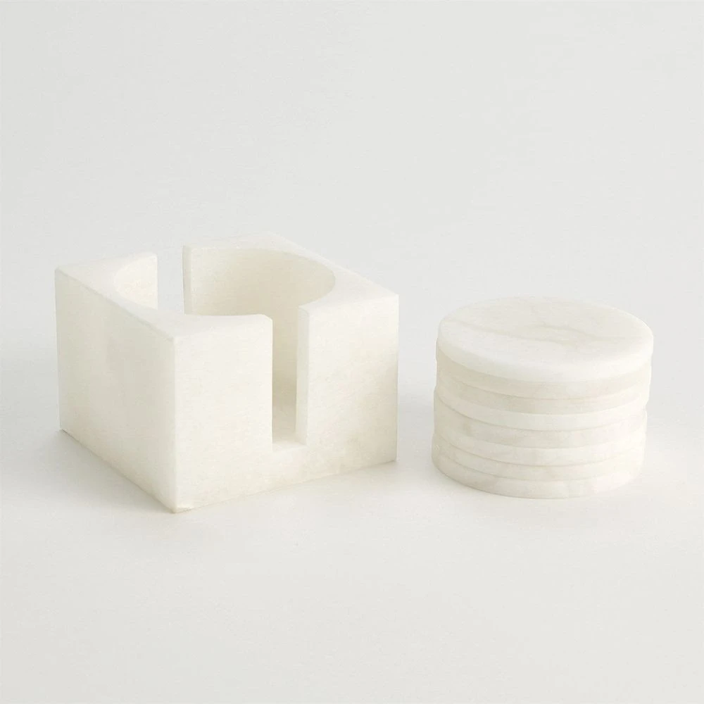 The Alabaster Coasters are made of Italian alabaster and fit perfectly in the square holder. As alabaster is a natural product, please be aware that there will always be variations in veining and color. Set of 8.