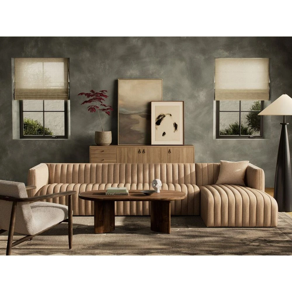 A dramatically channeled sofa in a palermo top-grain leather offers a mature, clean look inspired by modern menswear. Two-piece sectional with right arm-facing chaise, perfectly sized for smaller spaces.