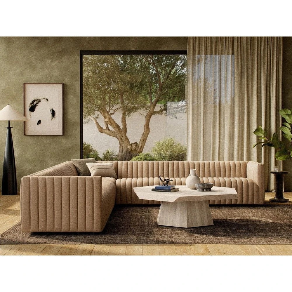 - Description: A dramatically channeled sofa wrapped in a palermo drift top grain leather creates a mature, clean look inspired by modern menswear. Three-piece L sectional sized for larger spaces.