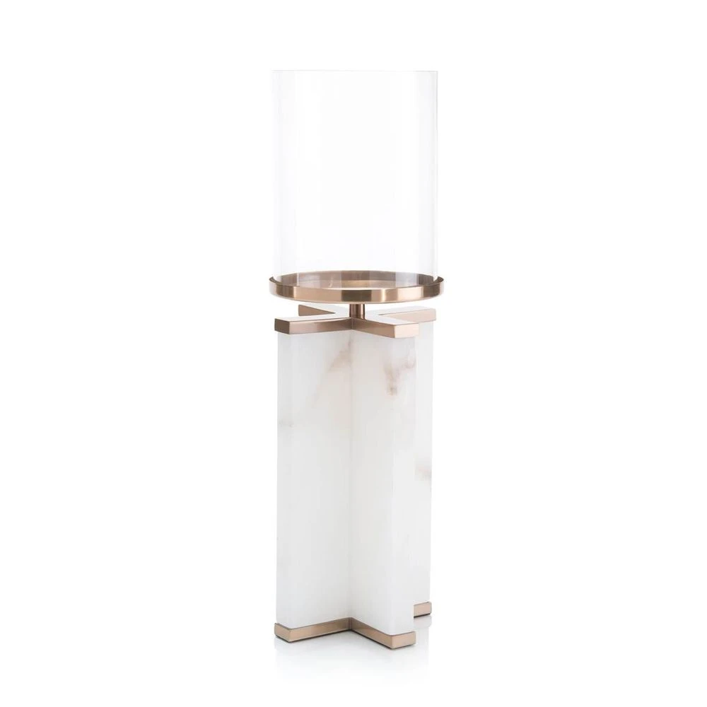 Alabaster candle holder in cross configuration with bronze finish cap and base. Glass shade included.