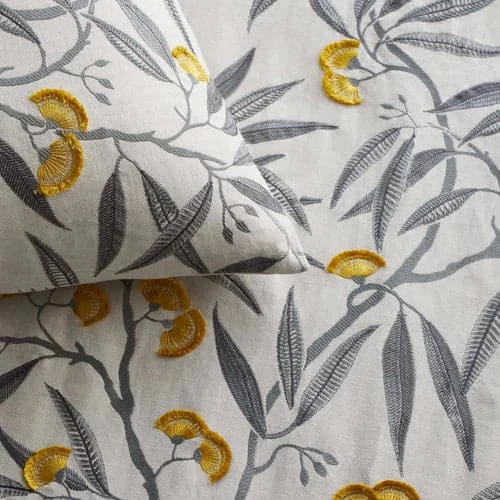 Inspired by an Egyptian floral plaque, Alyssum’s delicate, fringed flowers and grey leaves are embroidered onto a herringbone ground.