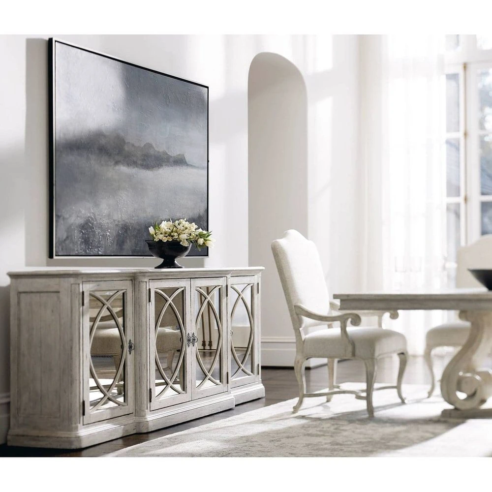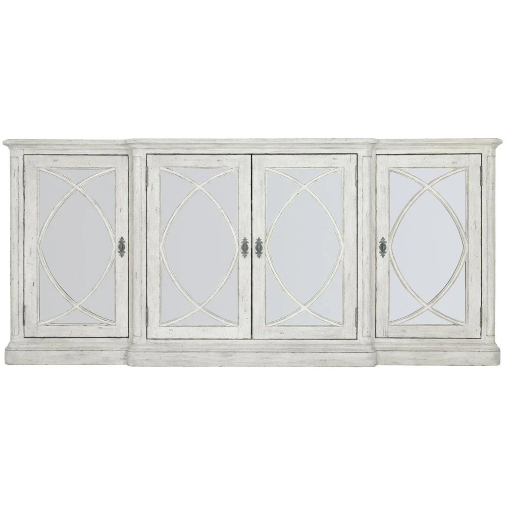 - Four doors with cast grille over inset antiqued mirrored glass panel