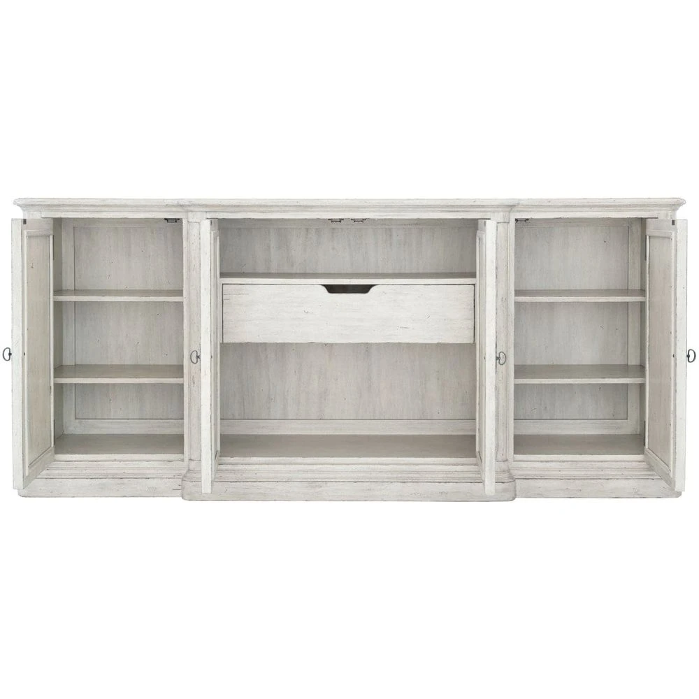 - Behind paired center doors is one fixed shelf, one drawer with wrapped pad and hand cut-out, and bottom shelf surface