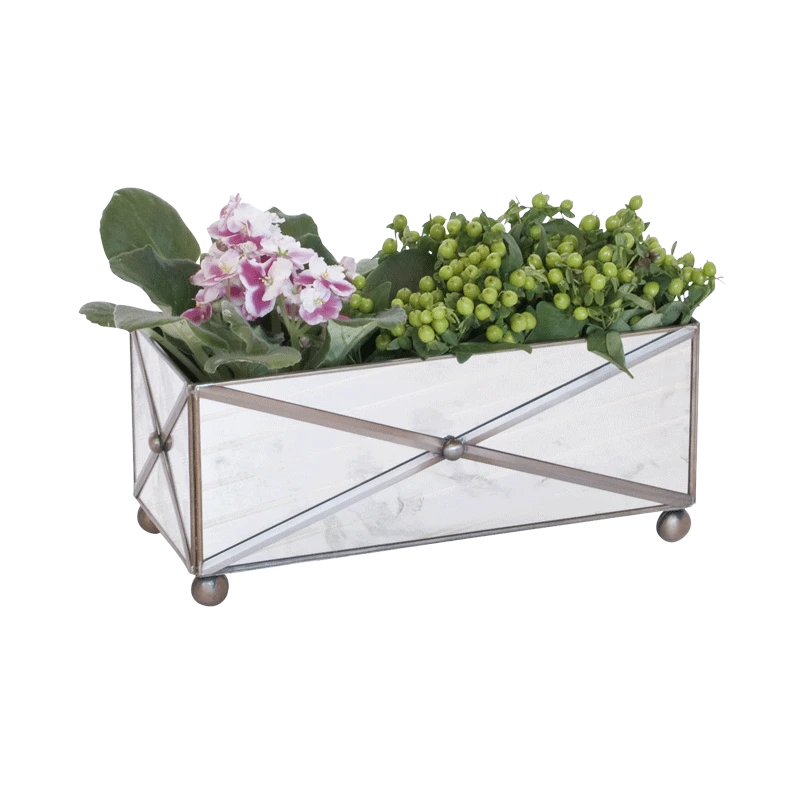 Description: Bring a touch of French provencal living to your indoor or outdoor garden room. This rectangular planter is finished with a distinctive crosshatch pattern and antique mirrors on raised ball feet.
