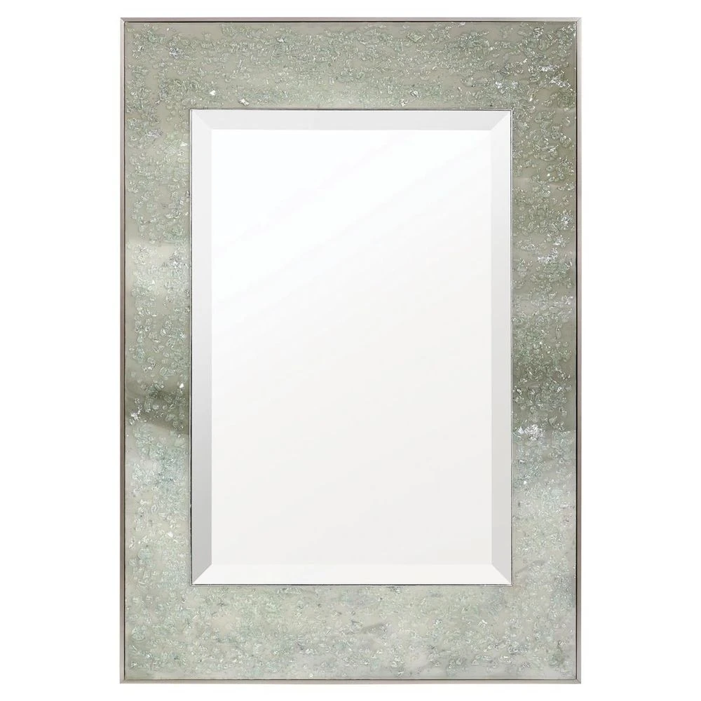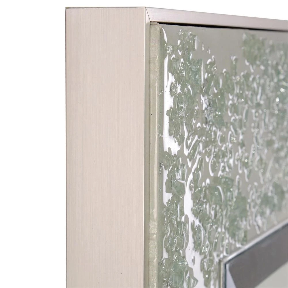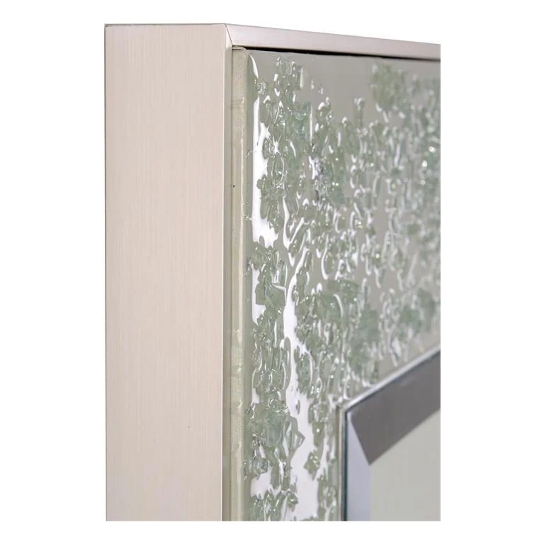 The Dove II mirror is a unique design where wall art is converted into a mirror. The canvas frame surrounding the modern beveled mirror is enhanced with tempered glass fragments and bits of silver leaf, embedded in a high-gloss vitreous finish.