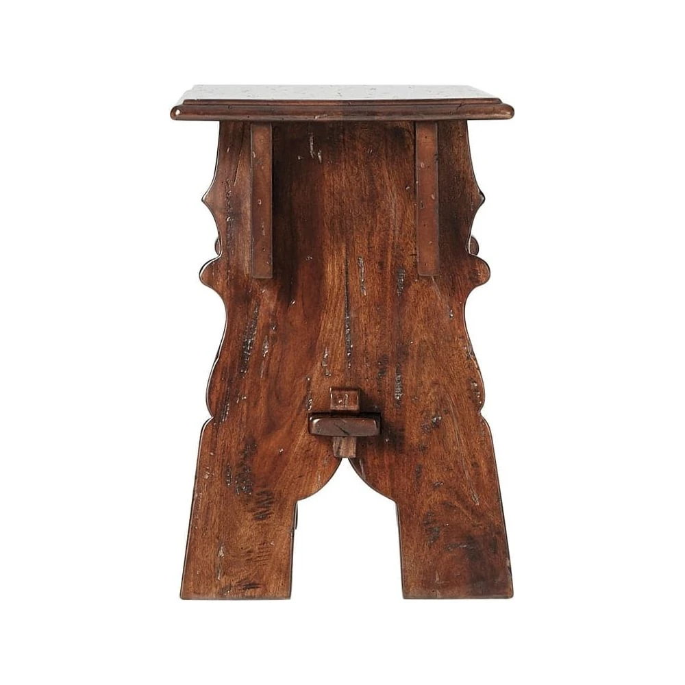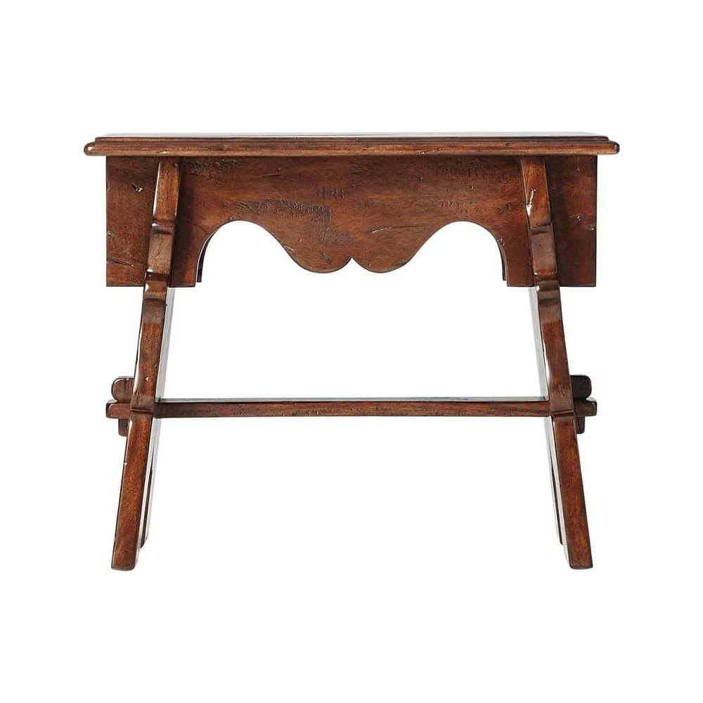 An antiqued wood Joynt stool, with serpentine apron on pegged splay legs joined by a stretcher. The original 17th century.