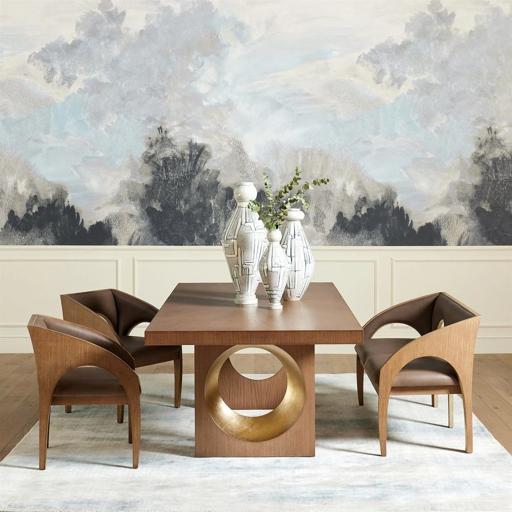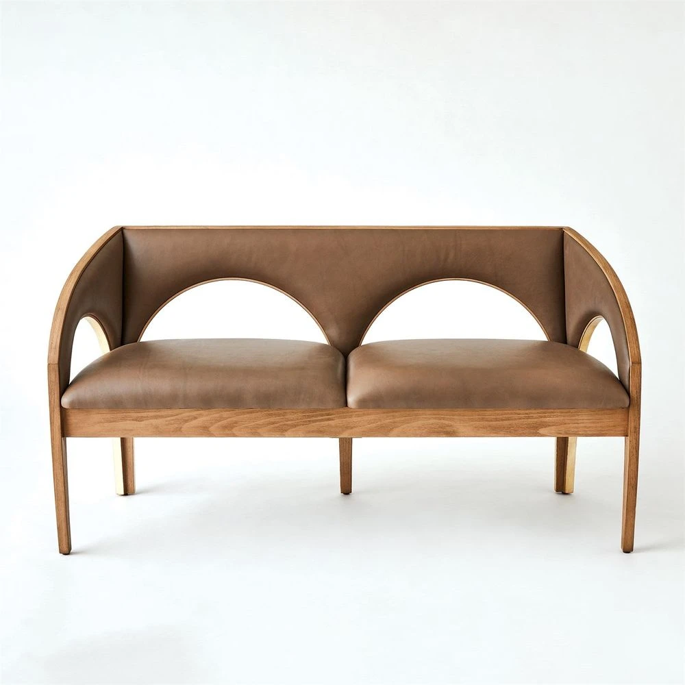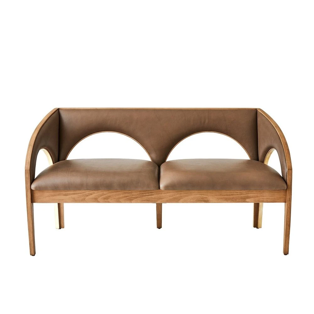 Description: Our Arches Bench is covered in luxurious leather and has a dyed eucalyptus veneer frame. The cool nutmeg tones perfectly contrast with the gold leaf accents on the base and the steel stretcher.