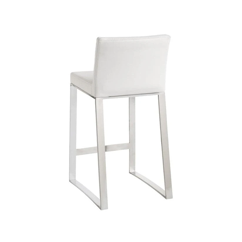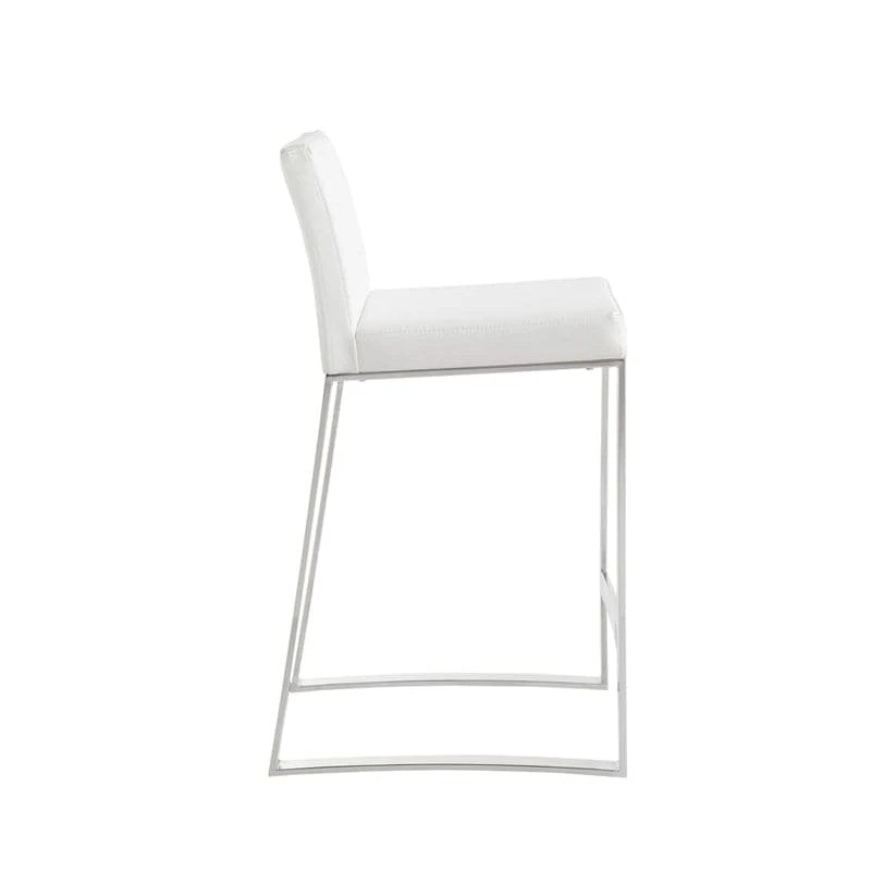 Contemporary counter stool designed for urban kitchens and all types of contract environments. Features a polished stainless steel base. Stocked in white, black and grey faux leather. Suitable for various dining, kitchen and bar spaces of all sizes.
