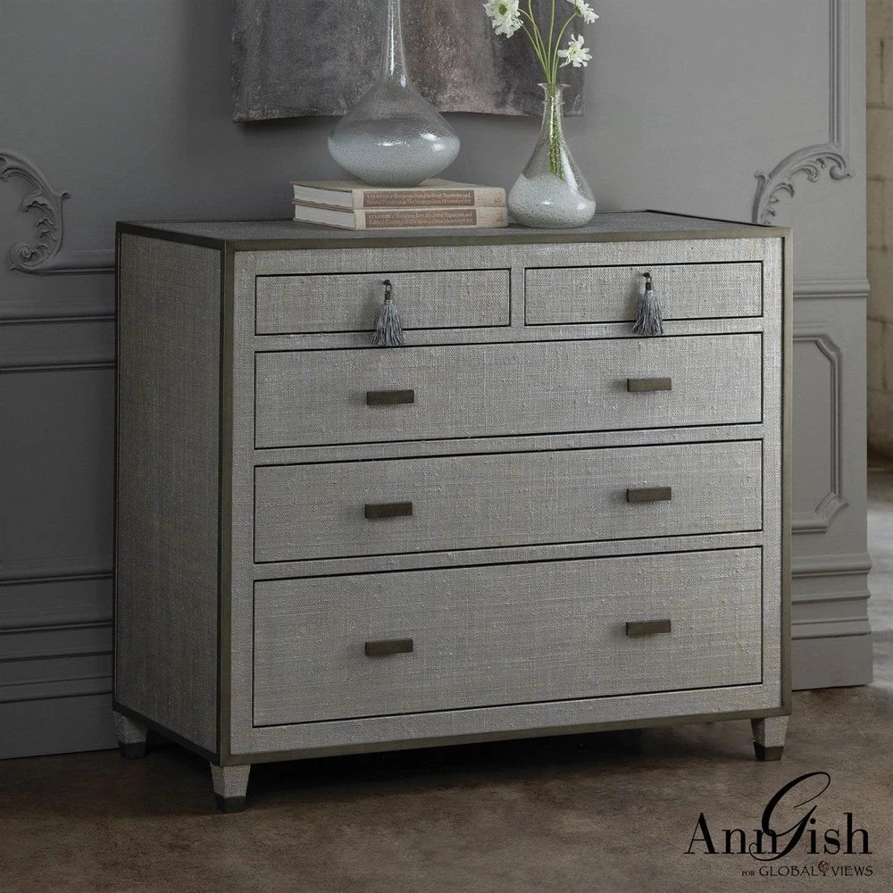 The Argento collection is inspired by finely textured, intricate Florentine silverwork, mixing soft shine and modern silhouettes. Each piece mixes silvered raffia coverings with pewter metal trim. Mixing function and aesthetics, this chest is perfect for storage and top two drawers of this are lined. Generous but not oversized, this bit of modern gilding is tailored but also opulent.