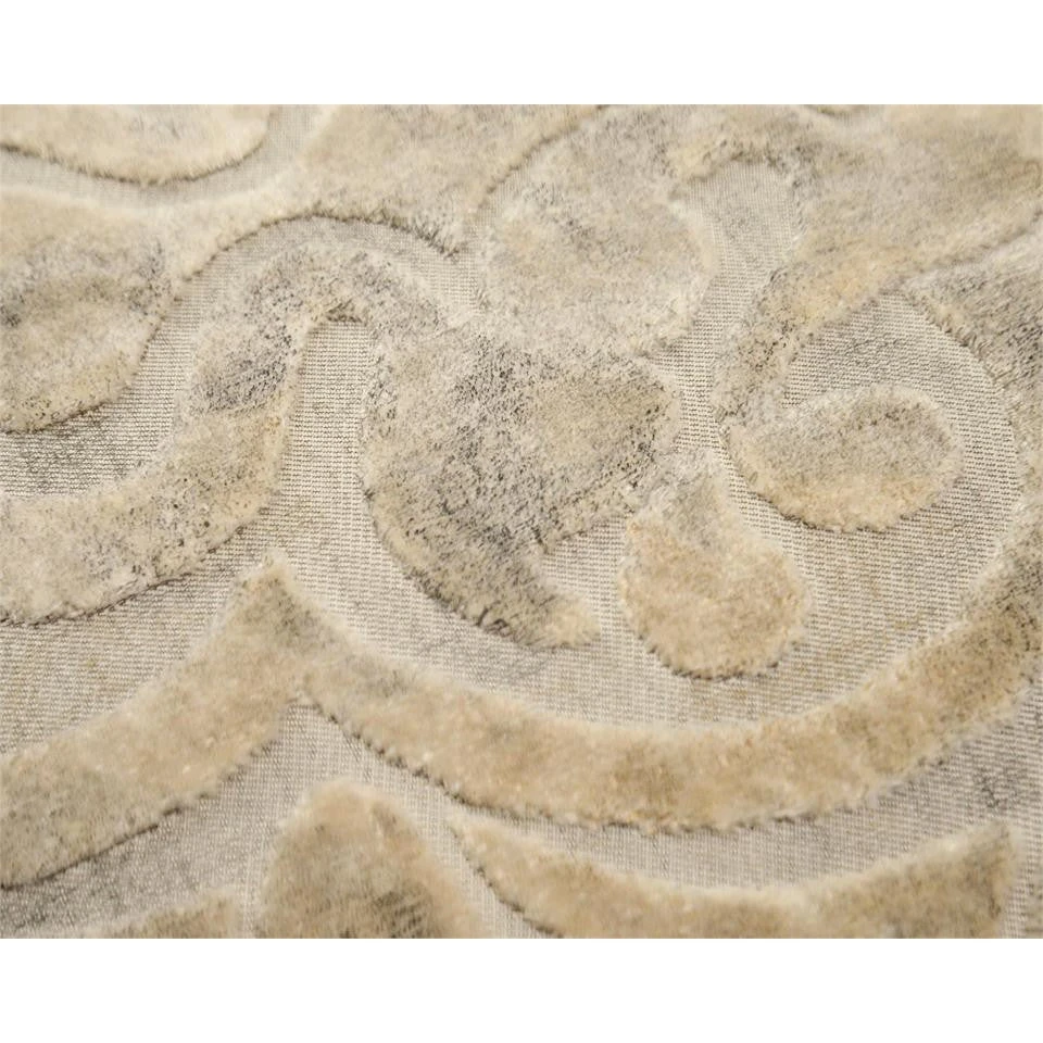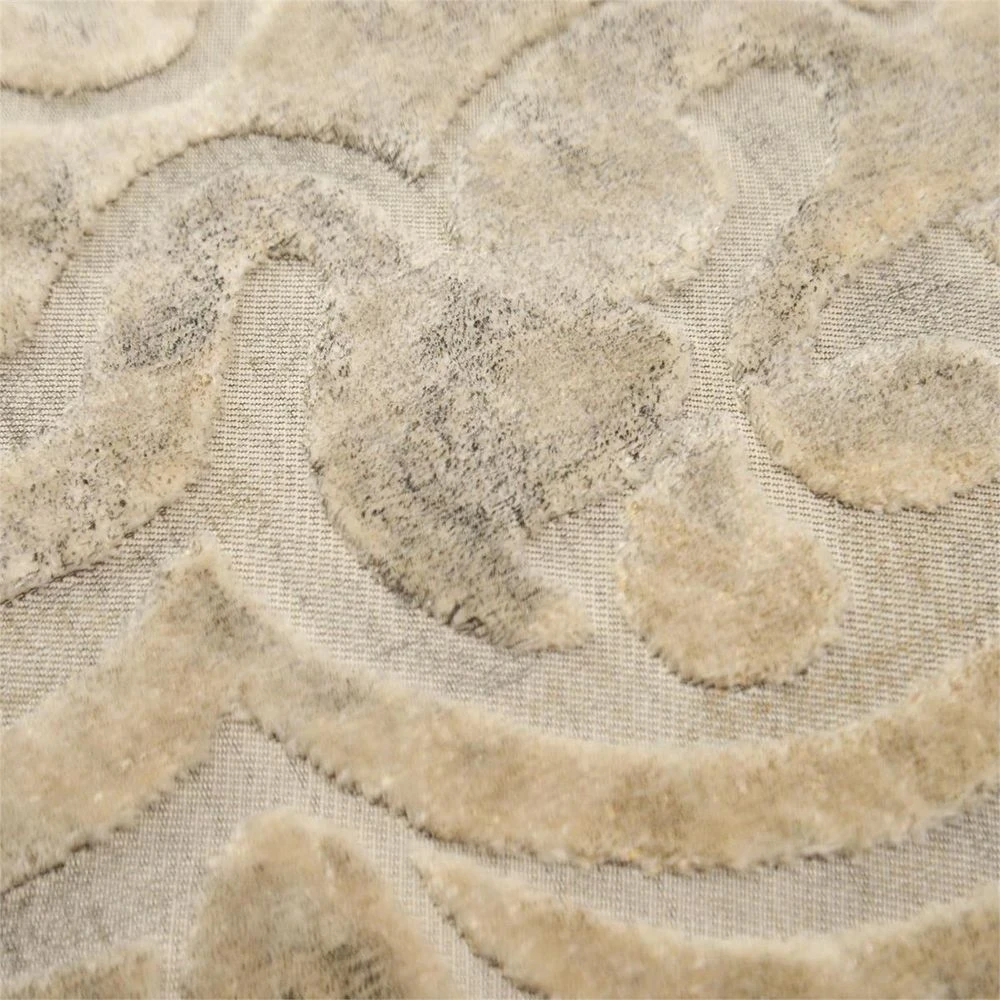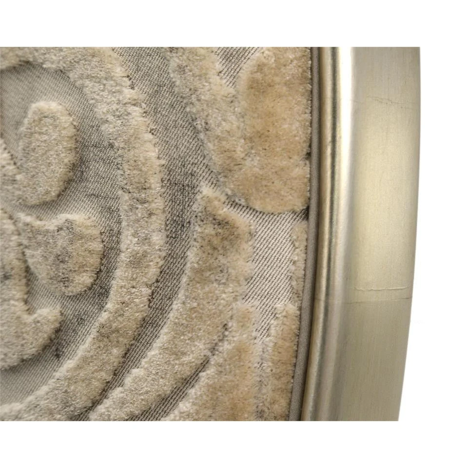 A contemporary dining side chair with an oval back is shown in a burnished silver finish and upholstered in a damask brown fabric.