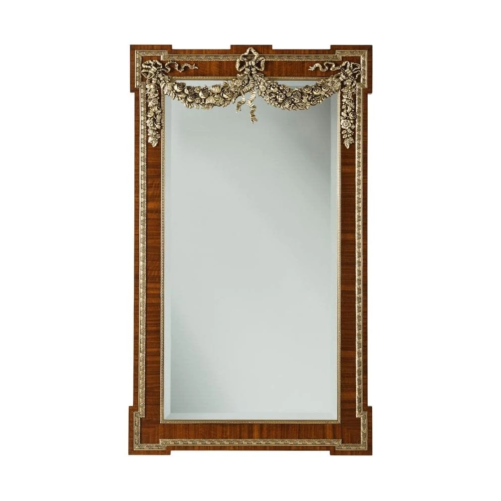 A fine mahogany and veneered wall mirror, the rectangular frame with angular protruding corners and fine brass molding, the crest draped with floral cast swags – the whole enclosing a beveled edge mirror plate.