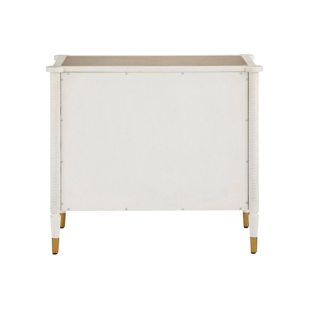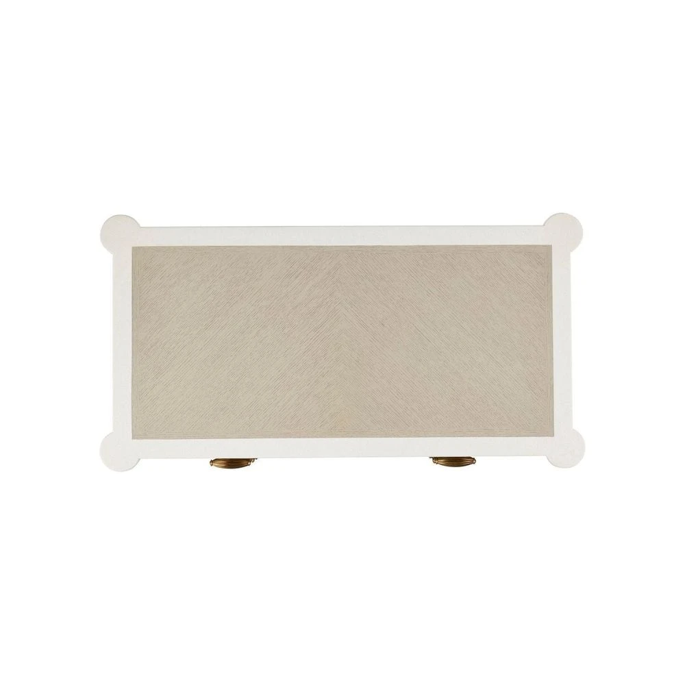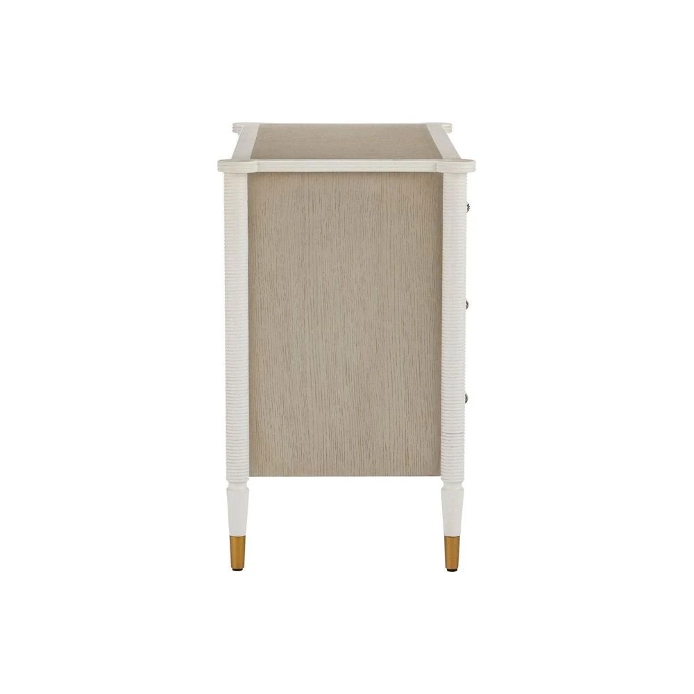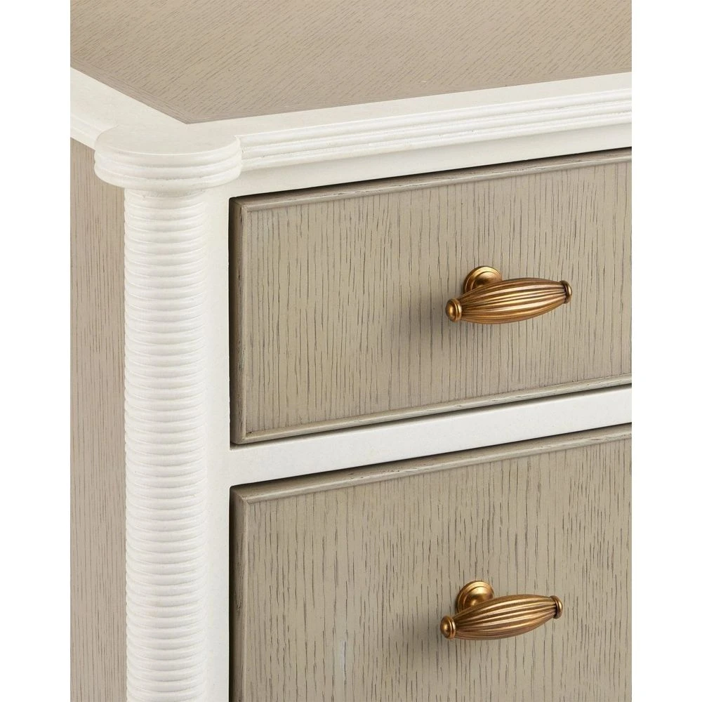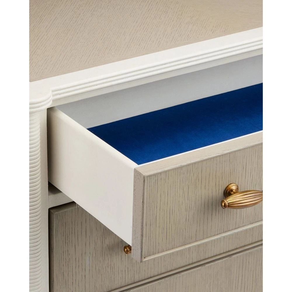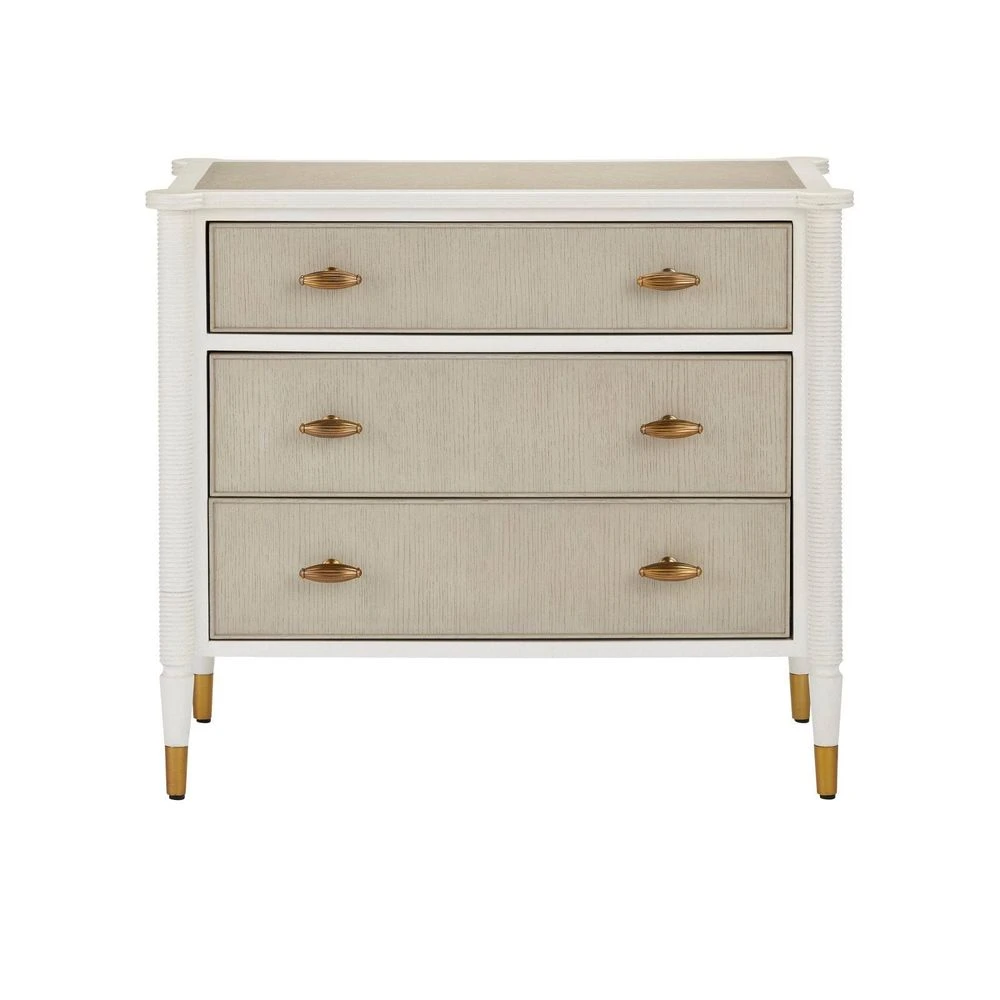 Description: Made of mahogany and oak in a mix of off-white and fog finishes, the Aster Three-Drawer Chest was inspired by an antique from the Winterthur Museum. The gray and white chest has three drawers on which the polished brass pulls are warm accents. Part of the Winterthur Collection, the chest has turned legs that are capped by ferrules to match the finish on the pulls. Each drawer is fitted with removable drawer liners.