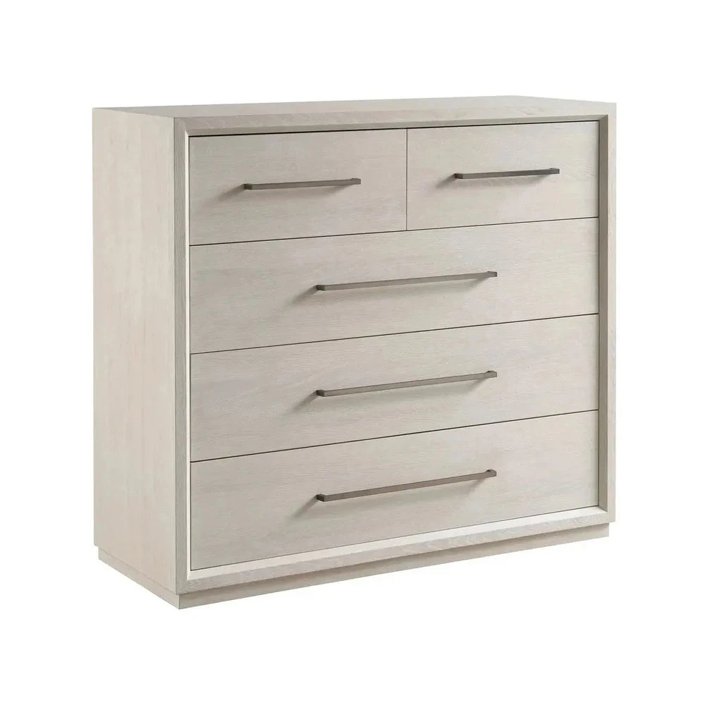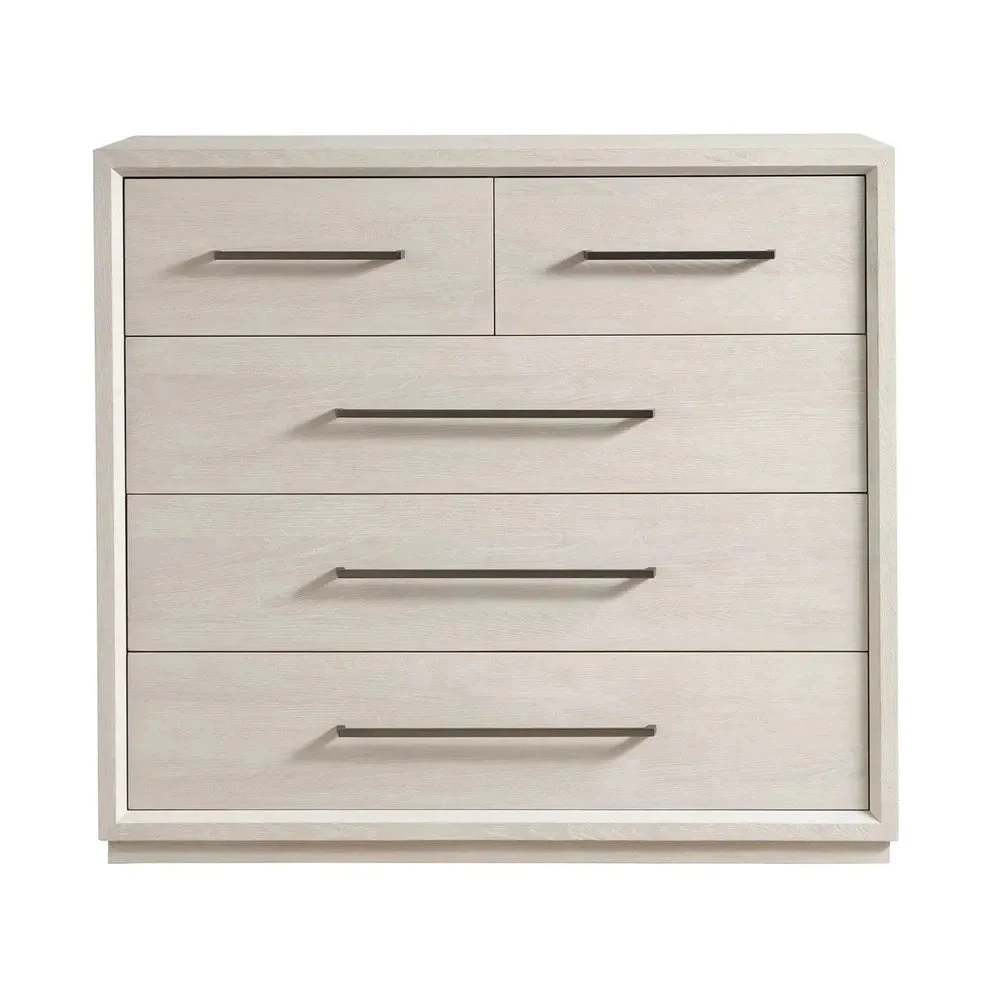 The Astrid Drawer Chest stands tall with five drawers, embodying a sleek and breezy modernity in a gorgeous neutral White Oak finish. Its stature is gracefully accentuated by long, chic bronzed pull hardware, adding a touch of sophistication to this functional piece. The chest’s design strikes a balance between contemporary flair and timeless elegance, making it a versatile addition to any modern bedroom.