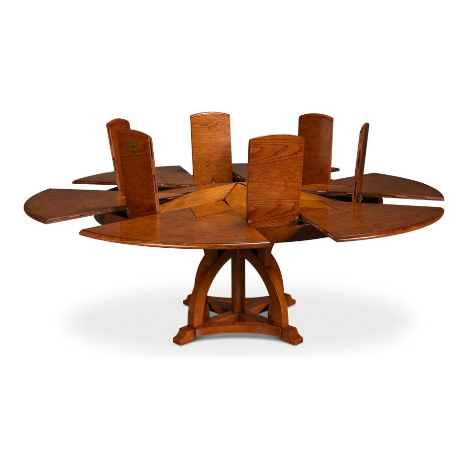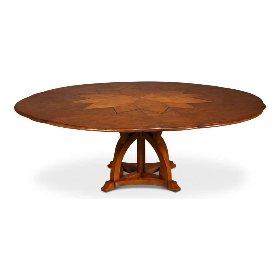 The Austin Jupe Table has an exquisite pedestal base that was inspired by timber frame architecture. The top has a unique inlaid star pattern that expands as you open the leaves. Sarreid”s newly reengineered Jupe Dining Tables bring a timeless 19th-century innovation into the modern age. Featuring a self-storing expansion mechanism crafted from extruded aluminum, these tables expand effortlessly, providing both smooth operation and simplified assembly.
