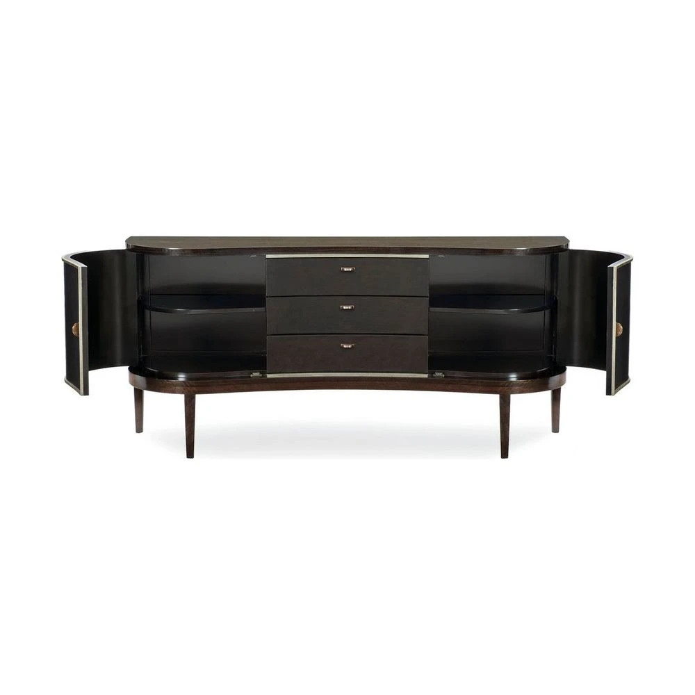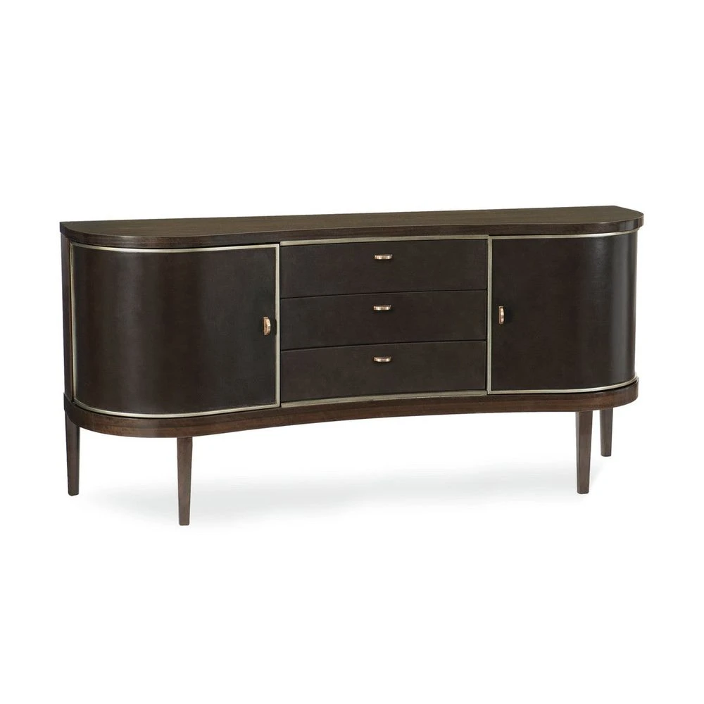 The Curving forms and long horizontal lines of the Streamlined Moderne movement have been updated in this low sideboard that is the perfect height for dining room service. Its high-style appeal comes from the fumed figured eucalyptus wood that has been finished to a high sheen in sultry Aged Bourbon and swept into two dramatic convex curves on each end of the piece. Three concave center drawers complete the graceful flow of this sideboard. They are wrapped in dark leather, trimmed in Smoked Bronze, painted on the inside in Dark Chocolate, and finished with elongated custom metal hardware. Behind the curvaceous exterior doors, find two cabinets painted in Dark Chocolate, each with one adjustable shelf. The sideboard rests off the ground on slender tapered legs.