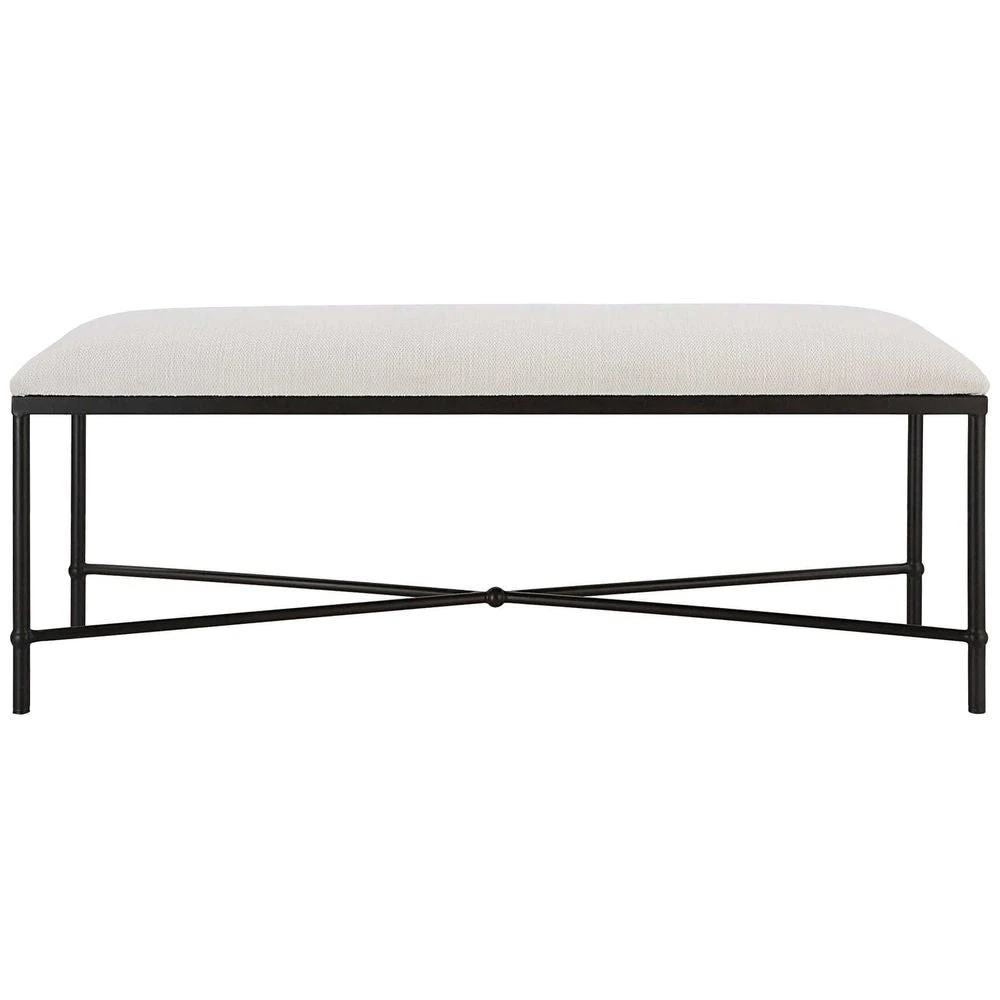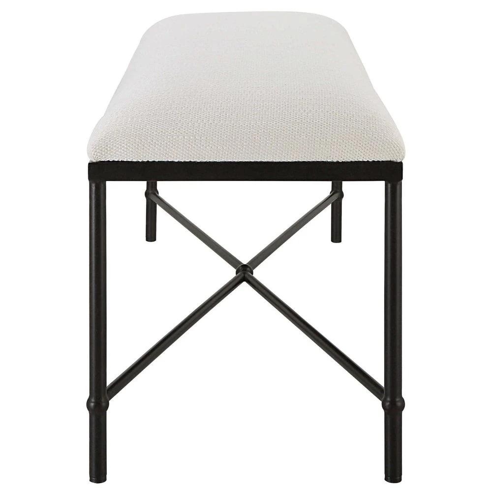 Thoroughly modern yet inspired by the classics, this bench displays a stylish black and white look featuring an iron frame in a satin finish, upholstered in a crisp white textured fabric.