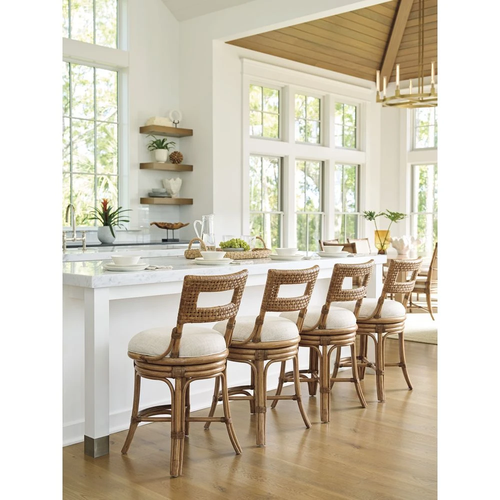 Marketing Copy: Capturing the refined, yet laid-back West Indies vibe of Key Biscayne, designs are crafted from Alder veneers in a light driftwood coloration. Drawer fronts are clad in woven raffia, complemented by custom hardware in an elegant burnished brass finish. The collection is a masterful blend of natural materials, including leather wrapped rattan, bamboo veneer, braided Abaca, Capiz shell, split rattan and honed travertine. It appeals to both the eye and the touch, inviting relaxation and evoking the spirit of effortless coastal living.
