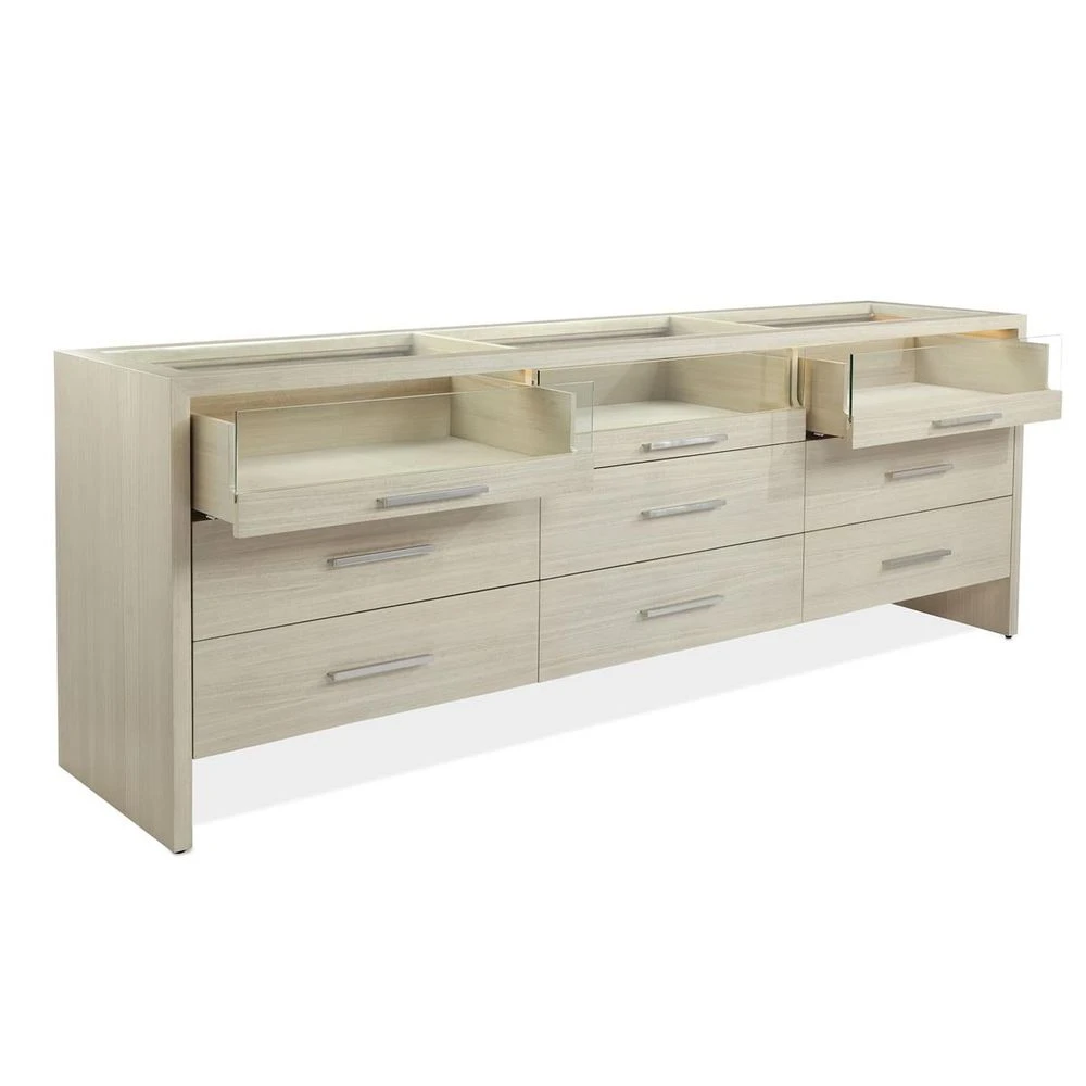 The Seaside Dresser is a fabulous statement piece with an irresistible coastal charm. Crafted from a blend of beech wood and eucalyptus wood, the piece is adorned in a gorgeous Ivory finish that evokes the atmosphere of a pristine sandy beach. Straight wood grain provides playful juxtaposition against clear tempered glass along the top surface. The six bottom drawers feature a Champagne finish around the interior, while the top three display leather inserts and matching tempered glass panels. This piece features soft-closing door runners, Polished Stainless Steel handles, and a motion-activated dimmable LED. Move your hand across to turn the light on and off, while holding your hand in place will adjust the brightness.