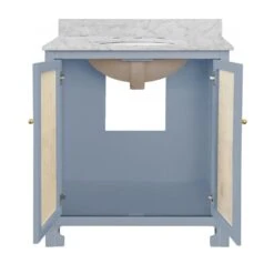 Blanche – Bath Vanity In Burl Wood W/ Ant. Brass Hardware, White Marble Top, And Porcelain Sink