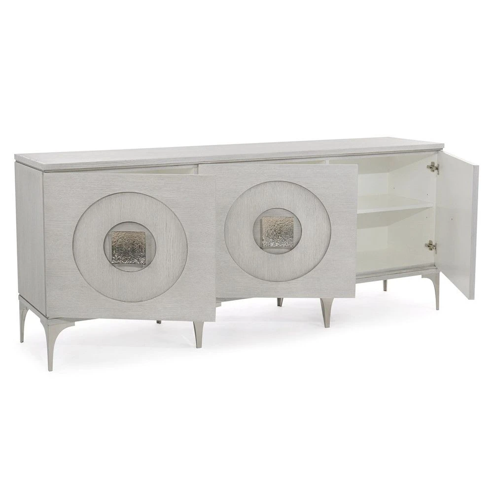 Description: Set on steel legs in brushed silver, the three doors of this impressive sideboard feature a pattern of circles reducing in size as they increase in depth. A concave, square handle in cast metal with a silver, textured pattern completes each door. The case and doors have a Carrara white finish.