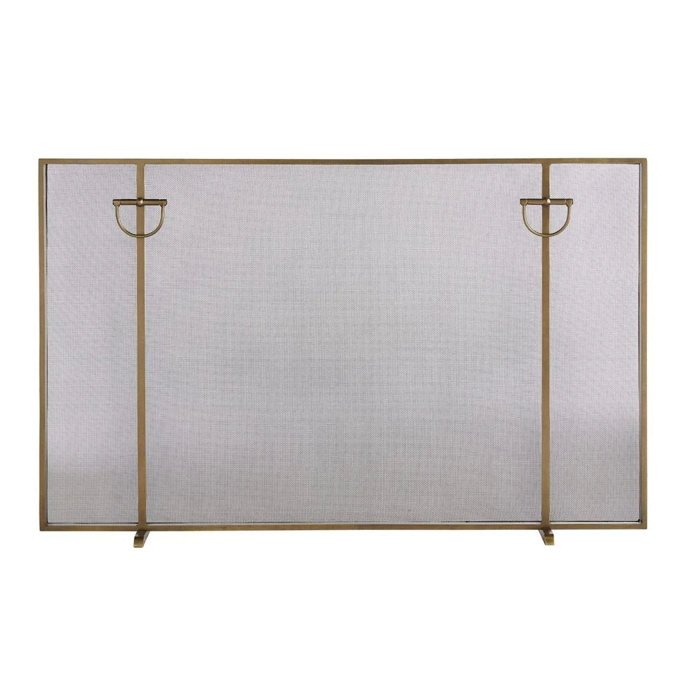 Warm up next to a freshly lit fire while stylishly keeping your space safe. Clean lines frame this antique brass iron screen and exposed decorative rivets recall a horse bridle-delivering a slight equestrian feel to the room it occupies. Its simple yet sophisticated design effortlessly functions in both traditional and modern settings. Screens may tarnish when exposed to high heat.