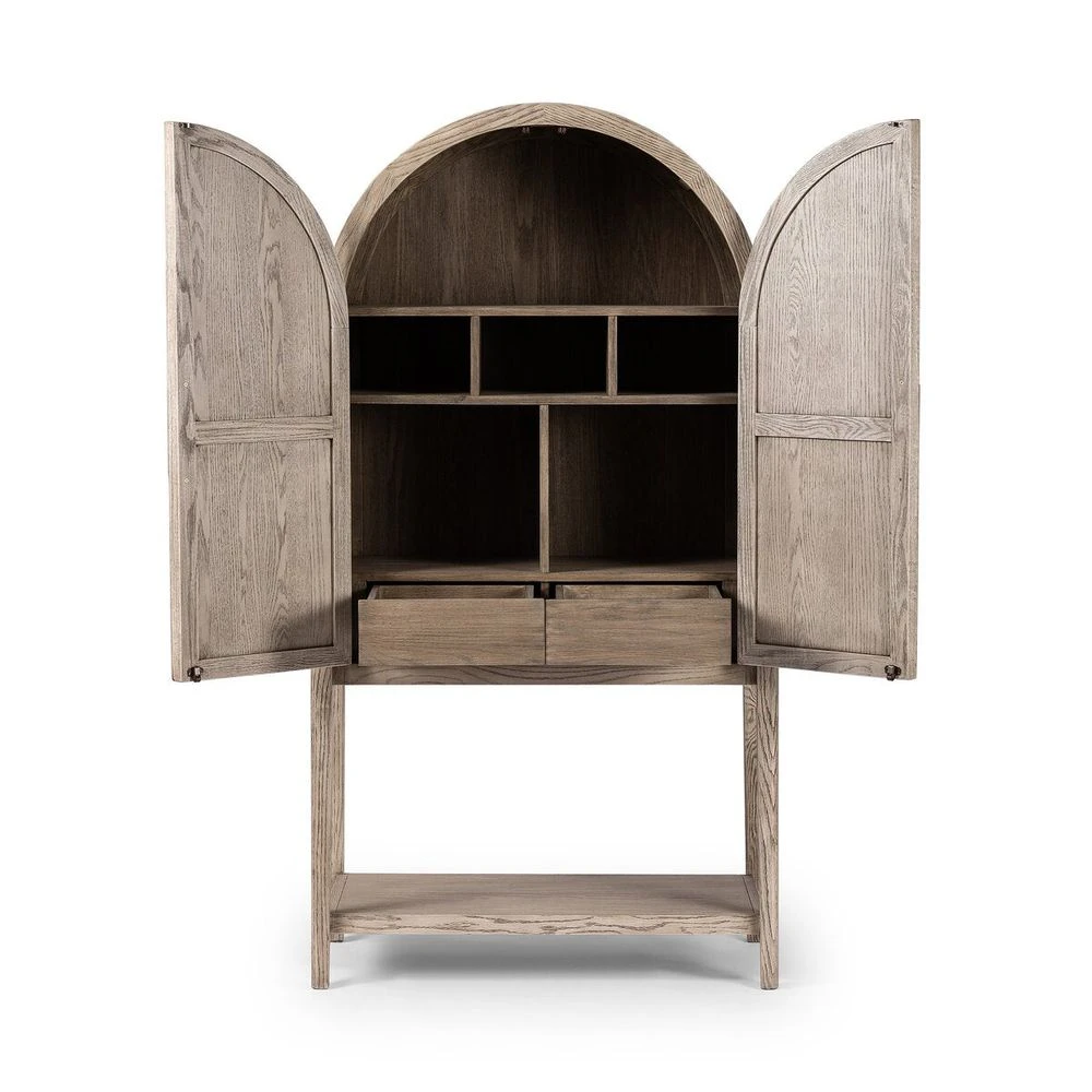 Arched cabinetry fuses French inspiration and Scandinavian simplicity. The finish selection is a design-forward combination of rustic white wood on the outside and natural oak covering the interior.