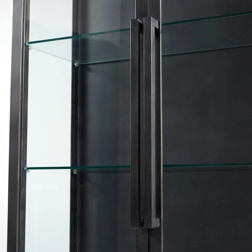The Bethlem Cabinet is a traditional piece of accent furniture. This full-size storage furnishing borrows elements from traditional decor, with its dark finish and decorative molding, as well as French country styling, with its ornate motifs and softly curved accents. These pieces are modern ‘rough lux’ interpretations of classic wood designs. Traditional forms are rendered in unfinished cold-rolled steel, making these cabinets unique. The steel is clear coated to seal and let the natural finish characteristics show through. This cabinet is perfect for any unassuming but upscale dining room or kitchen space, with ample storage space on its five surface levels.