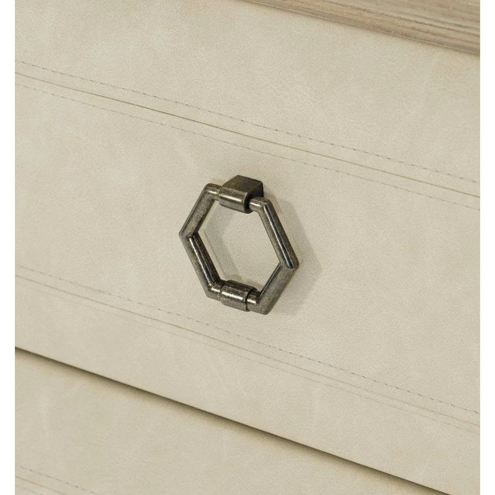 - Eight drawers with raised drawer fronts wrapped in performance fabric with double-needle stitching
