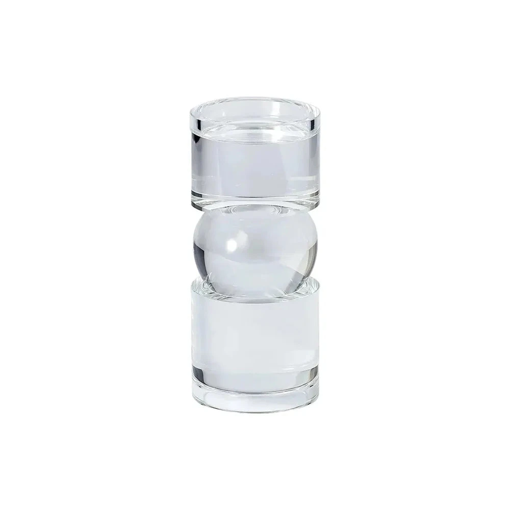 Perfectly clear glass has been shaped to form our Bipolar Crystal Candleholder. A round ball shape sits between two cylindrical pieces. Top with a pillar candle to create a warm glow. Please do not place in direct sunlight, crystal can magnify the light of the sun and potentially cause a fire hazard.