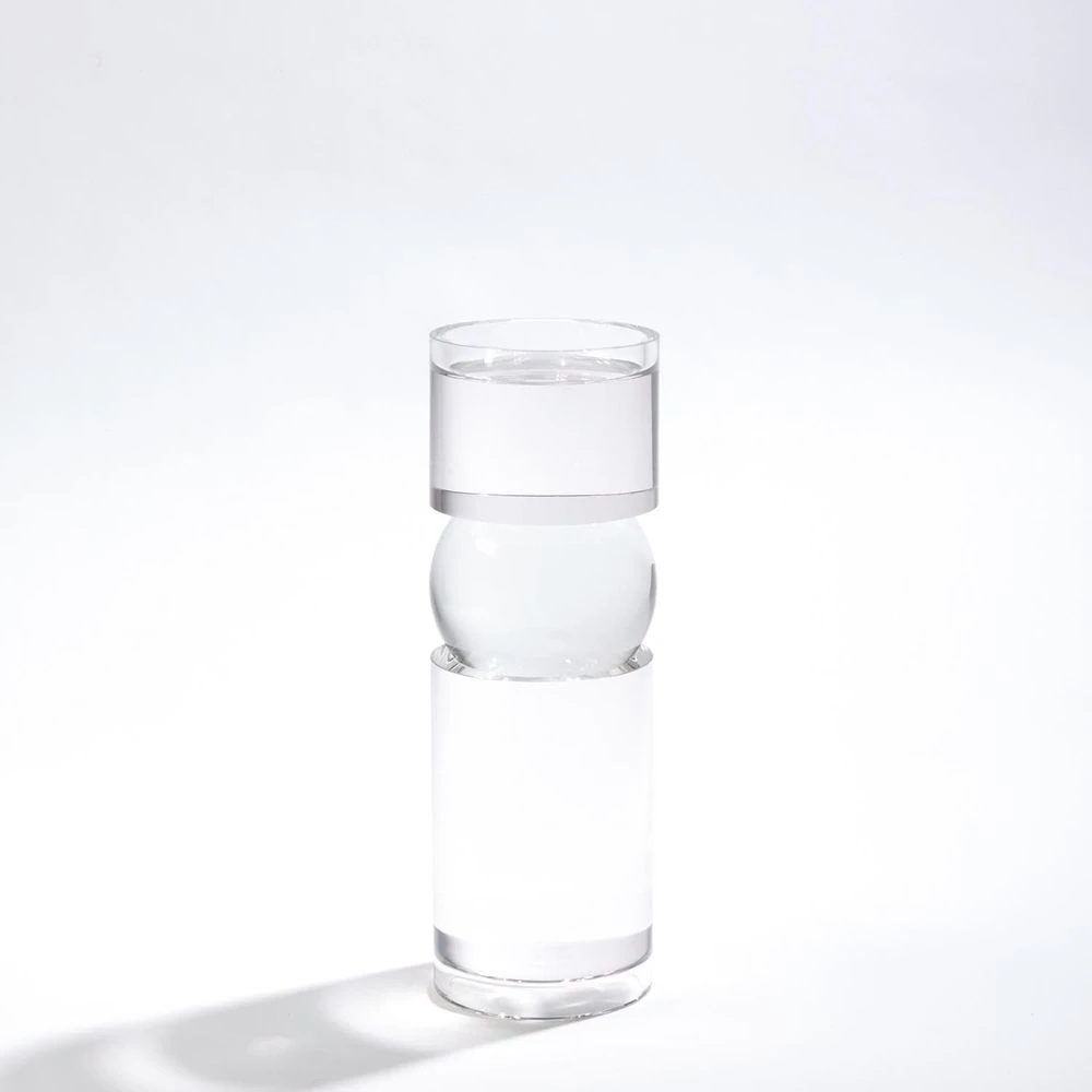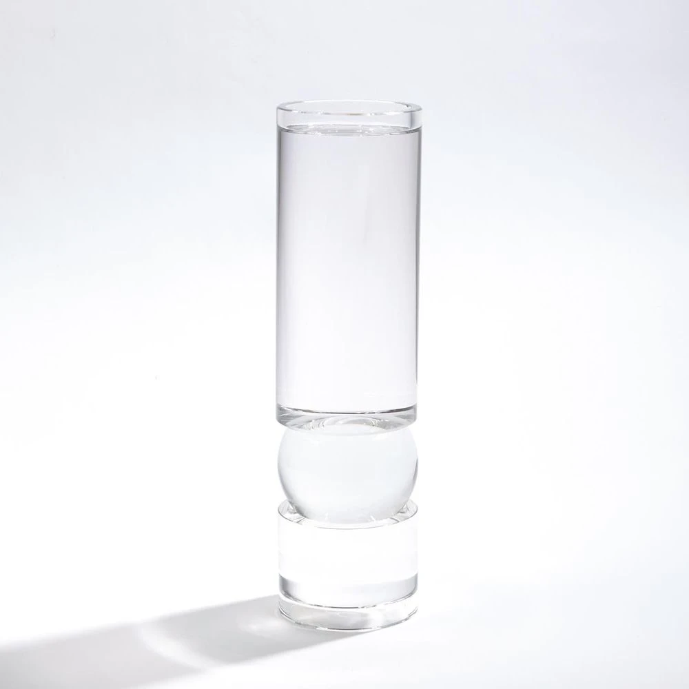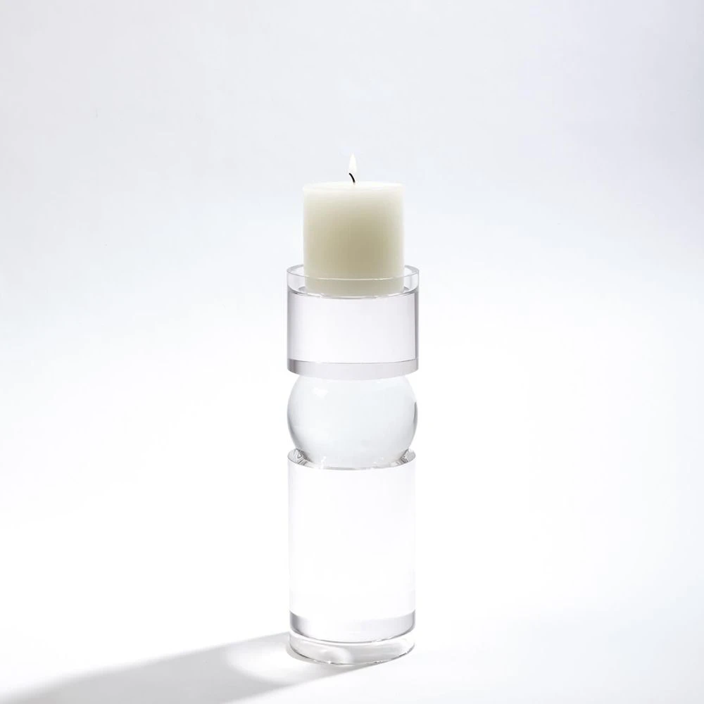 Perfectly clear glass has been shaped to form our Bipolar Crystal Candleholder. A round ball shape sits between two cylindrical pieces. Top with a pillar candle to create a warm glow. Please do not place in direct sunlight, crystal can magnify the light of the sun and potentially cause a fire hazard.