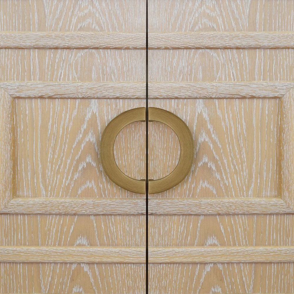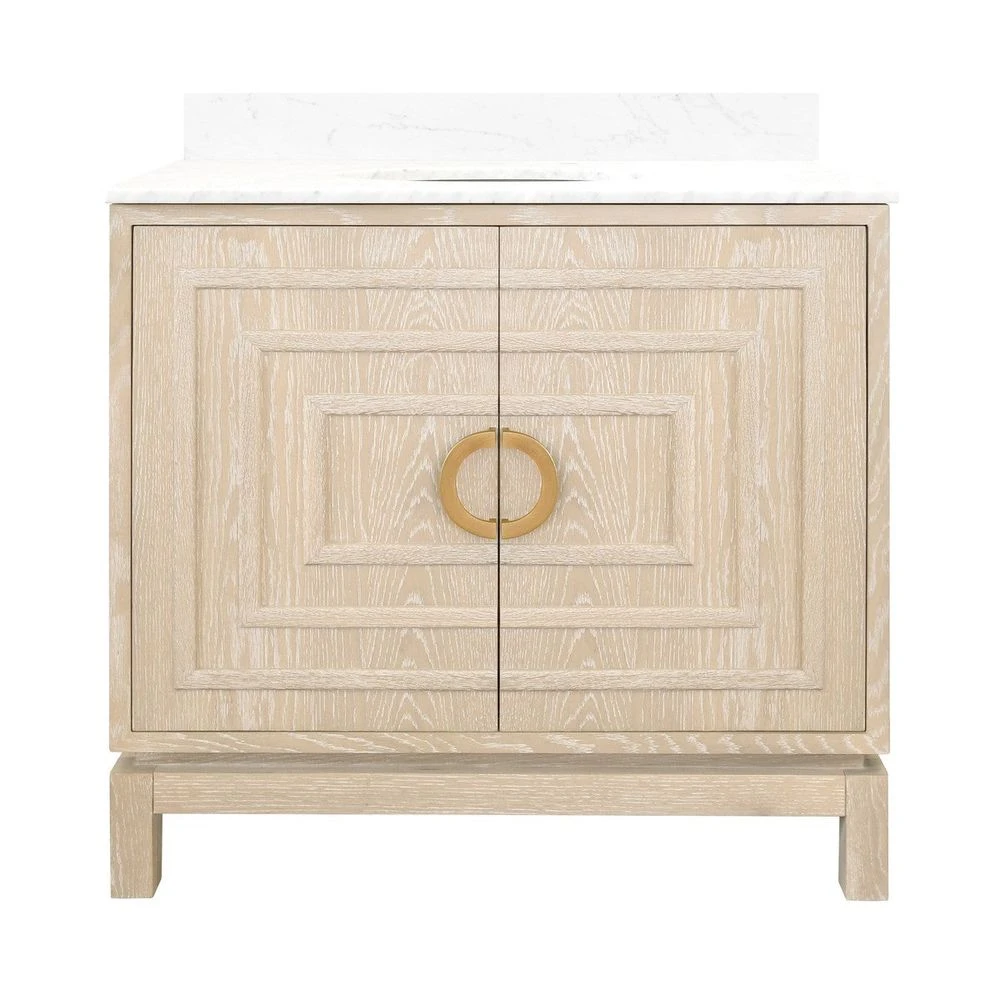 Description: The Art Deco-inspired Bixby bath vanity is the ultimate centerpiece for your primary bath or powder room. An artful combination of natural materials and geometric, dimensional surfaces, Bixby delights with rich cerused oak, repeating raised square pattern, and antique brass circle hardware. Crowned with white with grey accents Carrara marble top and porcelain sink. A 4″ tall, full length white Carrara marble backsplash comes detached for your custom installation.