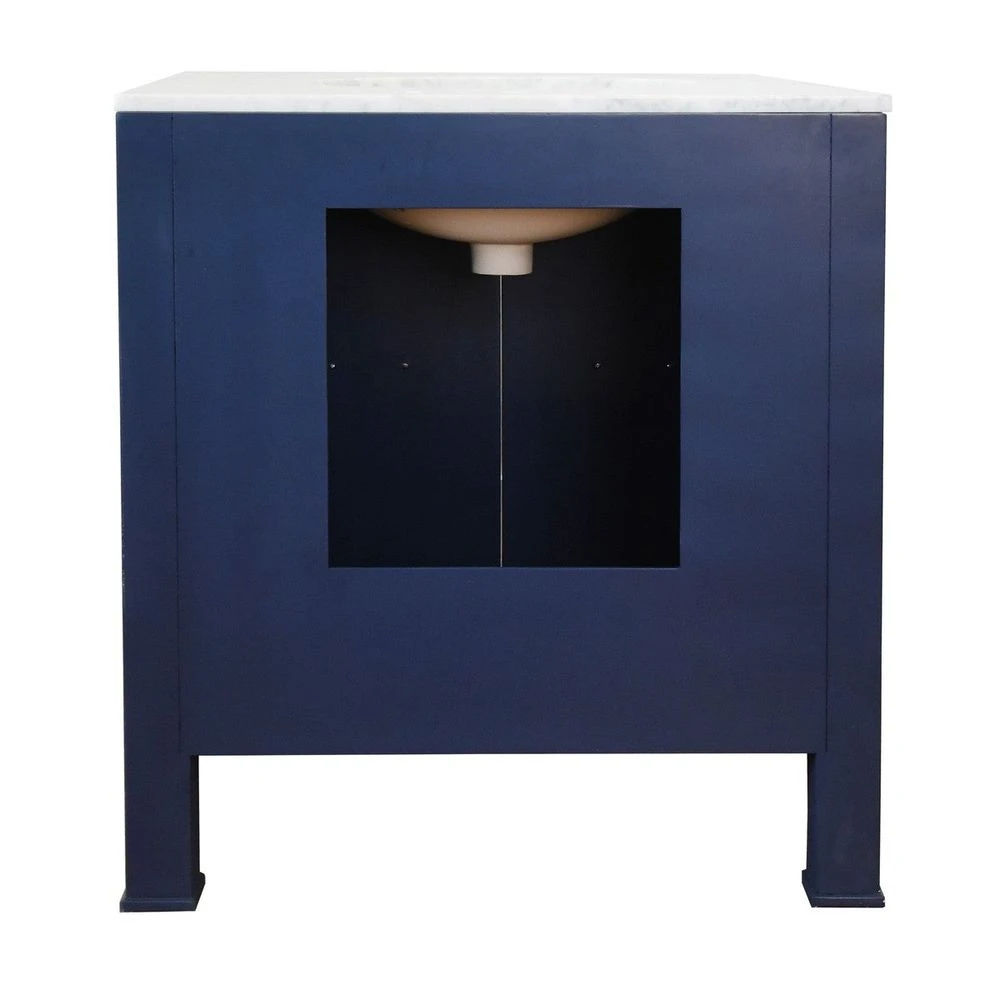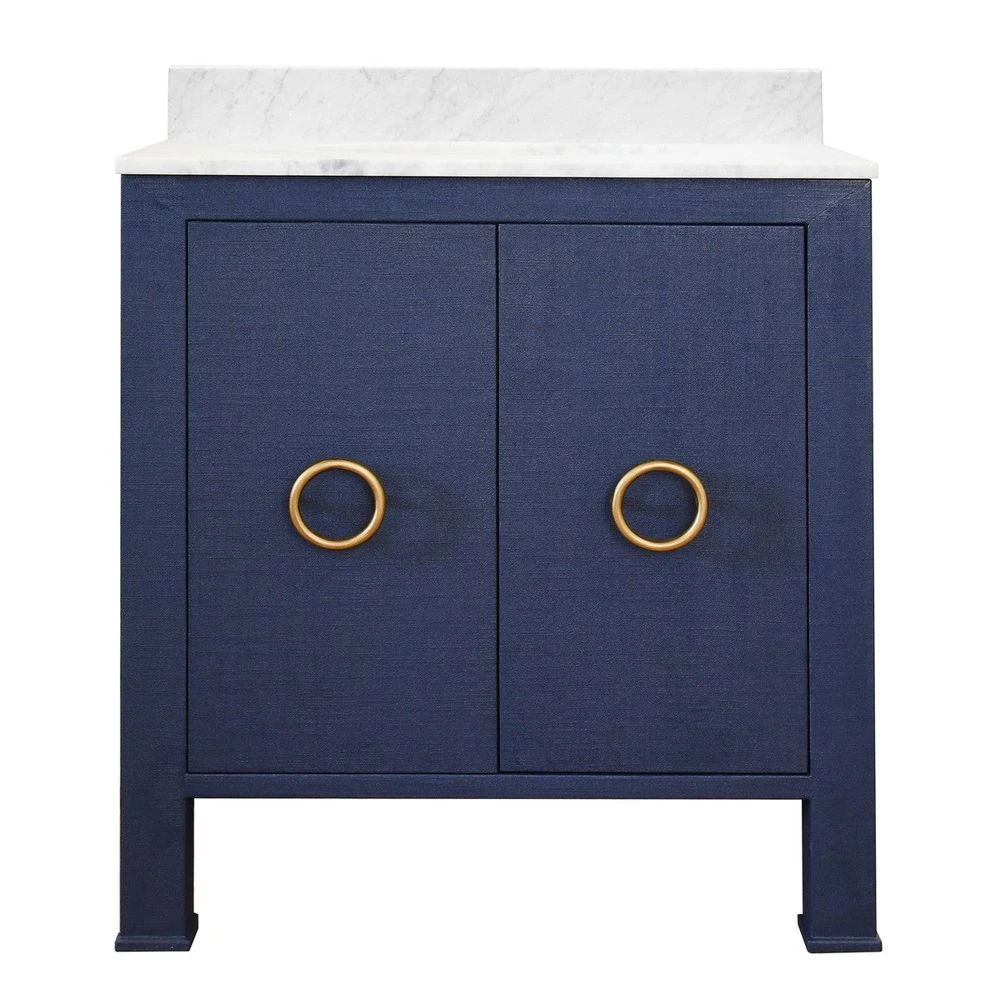 Description: You’ll want to design your bath or powder room around the high style material palette of our Blanche bath vanity. Dressed in textured navy linen and antique brass ring pulls, Blanche is an artful combination of color and texture. Includes a luminous white with grey accents Carrara marble top & backsplash plus a white porcelain sink.