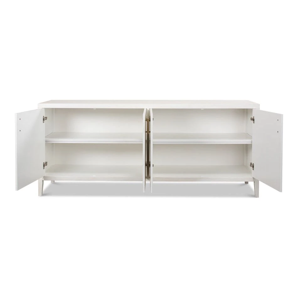 Welcome the Blanco 4 Door Buffet, a beacon of contemporary elegance. MDF and Ash Veneer unite in the 80″w x 18″d x 34″h masterpiece . With 2 adjustable shelves, it harmonizes practicality with style. Embrace the purity of White, infusing your space with sophistication and versatile storage solutions for a modern, refined living area.