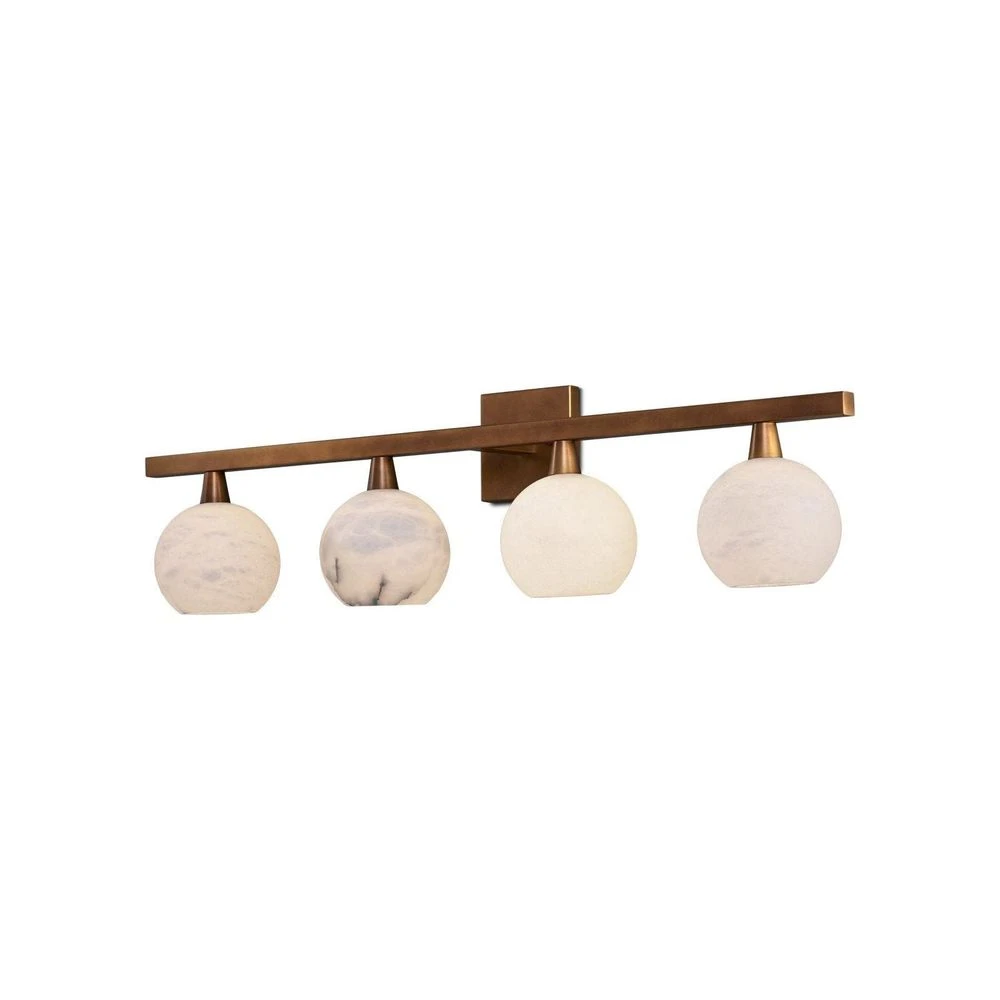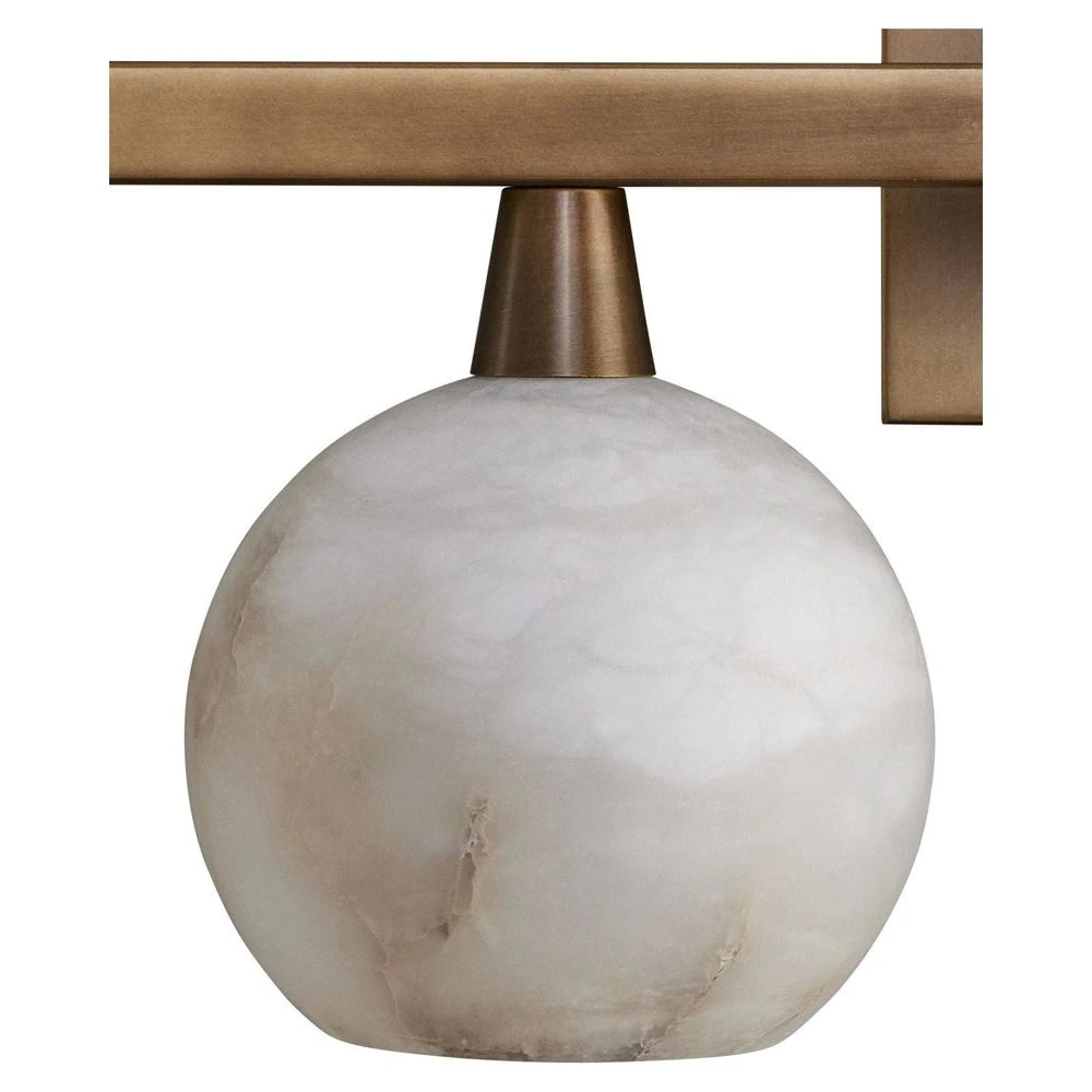 Description: The Bombelles Brass Bath Bar was designed to spread abundant light over a bathroom counter; the fixture joining others in the Bath Collection. The globes will be luminous when they are lit, as they are made of natural alabaster, and the antique brass finish on the metal adds warmth to the design. Alabster is a natural material, so there will be slight variations in each of the fixtures.