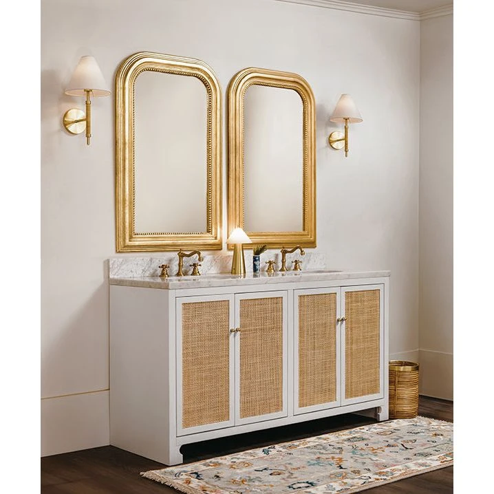 Description: BATH VANITY IN MATTE WHITE LACQUER WITH CANE FRONT DOORS, WHITE MARBLE TOP, DOUBLE PORCELAIN SINKS, AND POLISHED BRASS KNOBS, 60″ WIDE