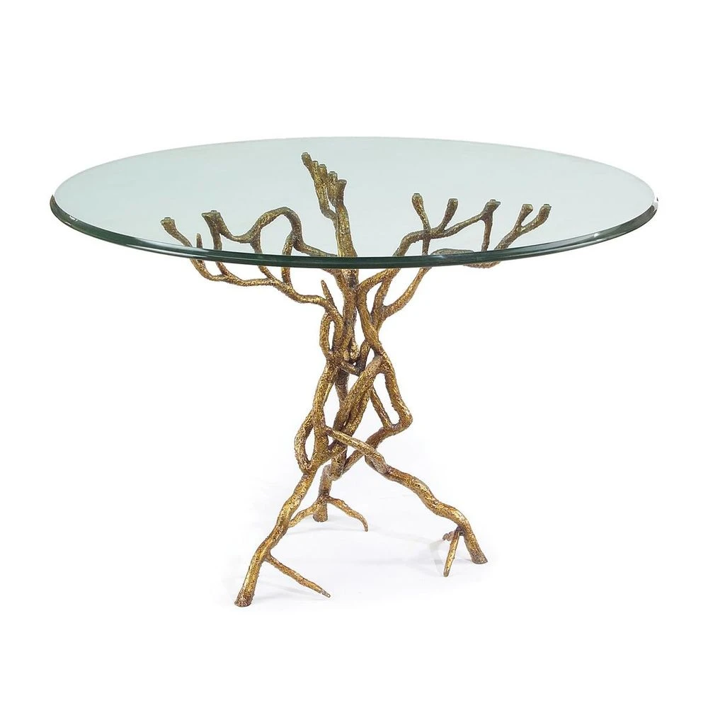 A glass top is supported by a sculpted metal base in the form of twisted branches. The finish is old gold.