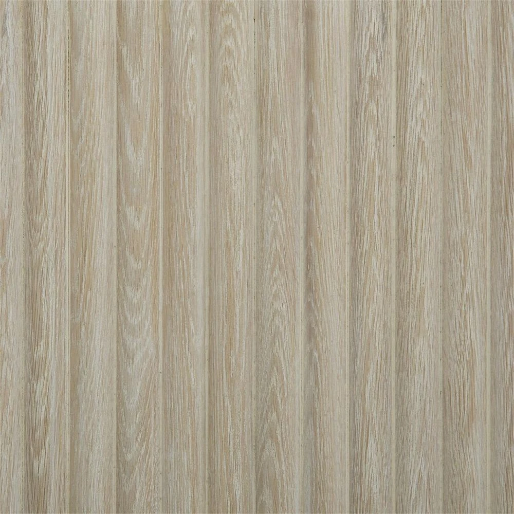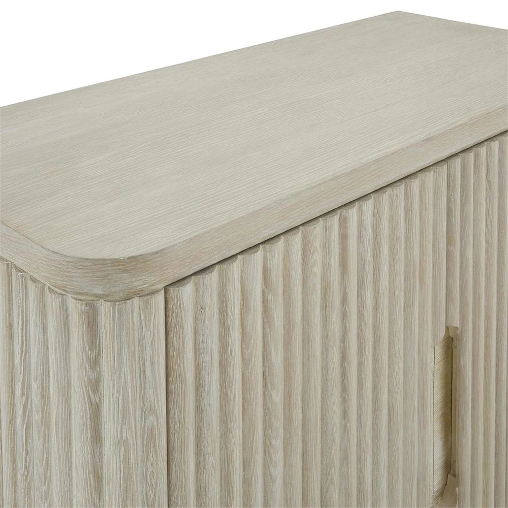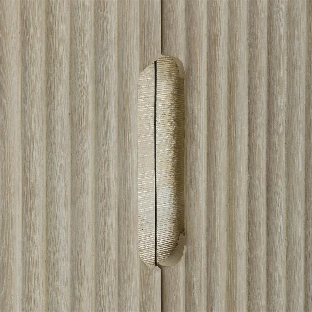 The Breeze Chest showcases sophisticated neutral tones that are greatly elevated through playful curvature. Crafted from oak wood with a gorgeous White Washed finish, the frame demonstrates a fluted pattern adorning the sides and cabinet doors. Both doors feature a groove handle, revealing a tasteful striped pattern finished in silver leaf. The rounded edges of the tabletop, along with four slender legs, complete the look of this delicate statement piece.