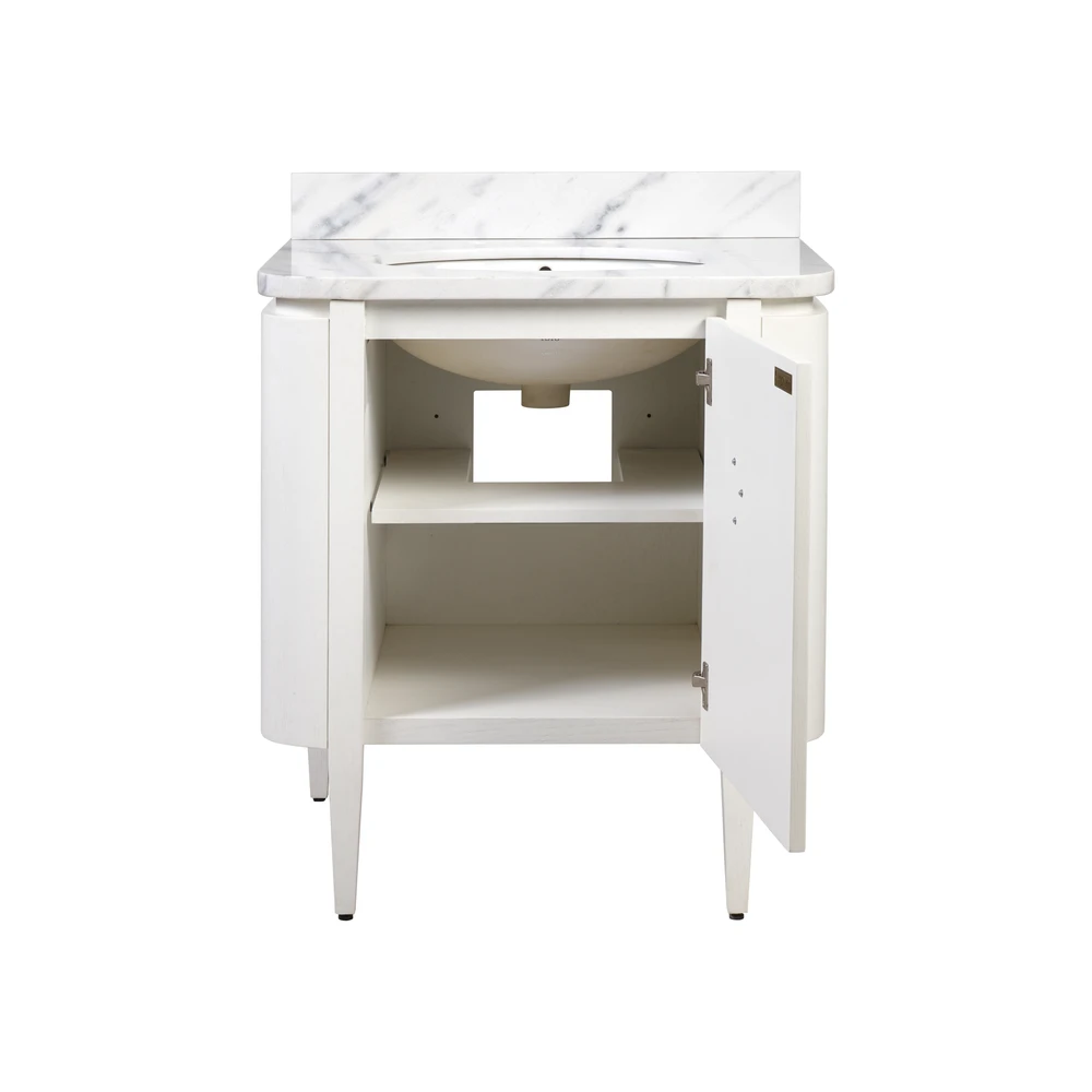 Description: The impressively sized brass flower pull on the Briallen 30″ White Vanity is a stunning ornamentation that contrasts the cerused white finish. The interior has one adjustable shelf and there is an optional wood tray that attaches to the inside of the door. The white Carrara marble top is fitted with a white oval undermount sink. Other fine design attributes include soft-close door hinges and a matching marble backsplash.