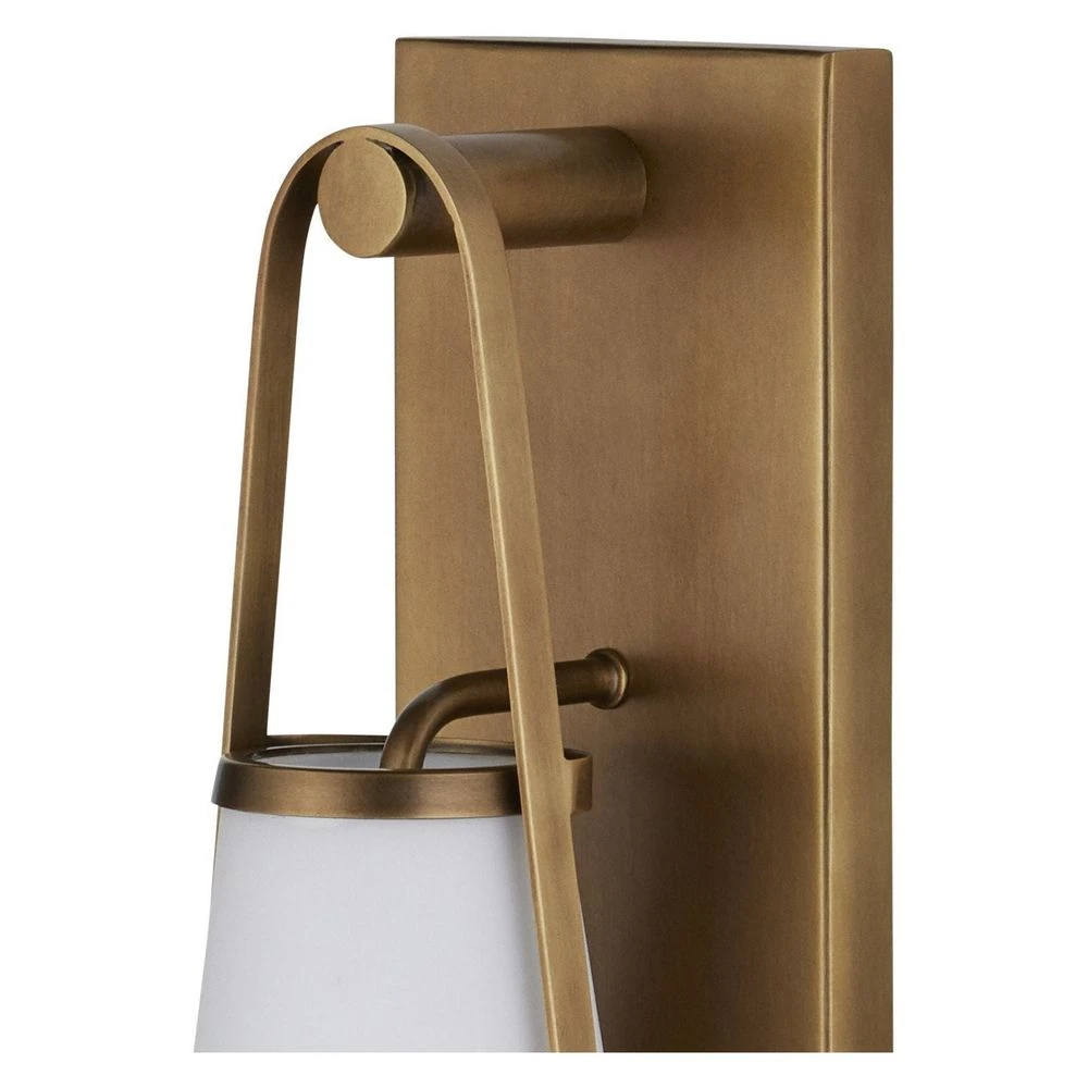 Description: The Brompton Brass Bath Wall Sconce dangles its shade like it is balancing a canister filled with illumination. Designed with a slim, rectangular wall-plate made of wrought iron in an antique brass finish, the knob from which the shade hangs and the handle that cradles it are also in metal in the same finish. The opacity of the beautifully shaped shade on the gold wall sconce creates a luminous glow.