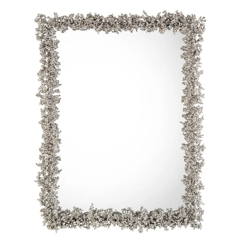 The Fog Mirror showcases a sophisticated mystique that greatly elevates an interior space. Crafted from metal in a plated nickel finish, the rectangular frame features an ethereal appearance reminiscent of a dense mist cloud. Sporadic shapes mingle with pristine metallic tones, creating a stylish focal point.
