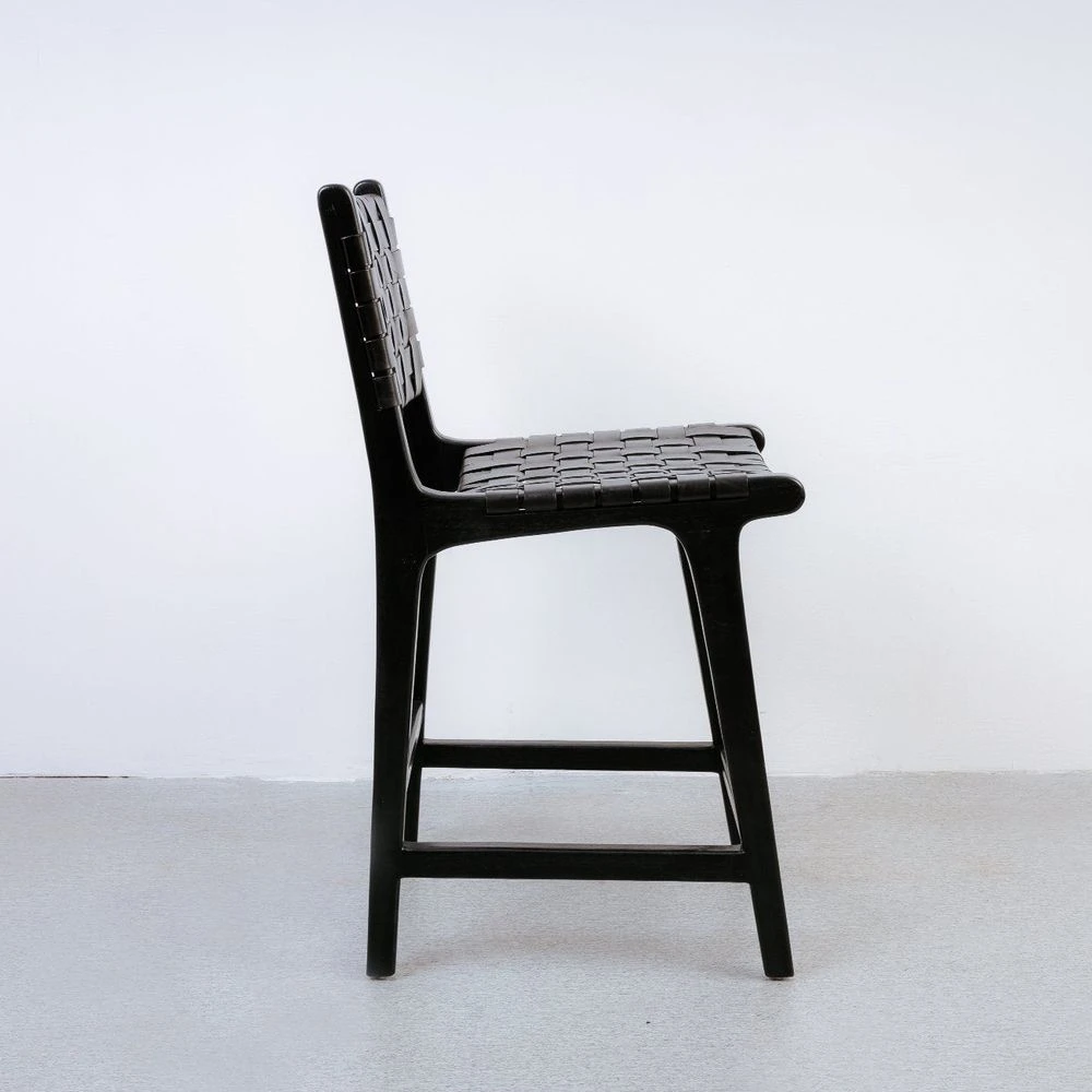 This handsome stool is the perfect addition to modern and contemporary style spaces alike. A sturdy teak frame provides ample support for the woven leather strap seat and back. The simple design allows the texture of the weaving to shine through. Available in brown or black.