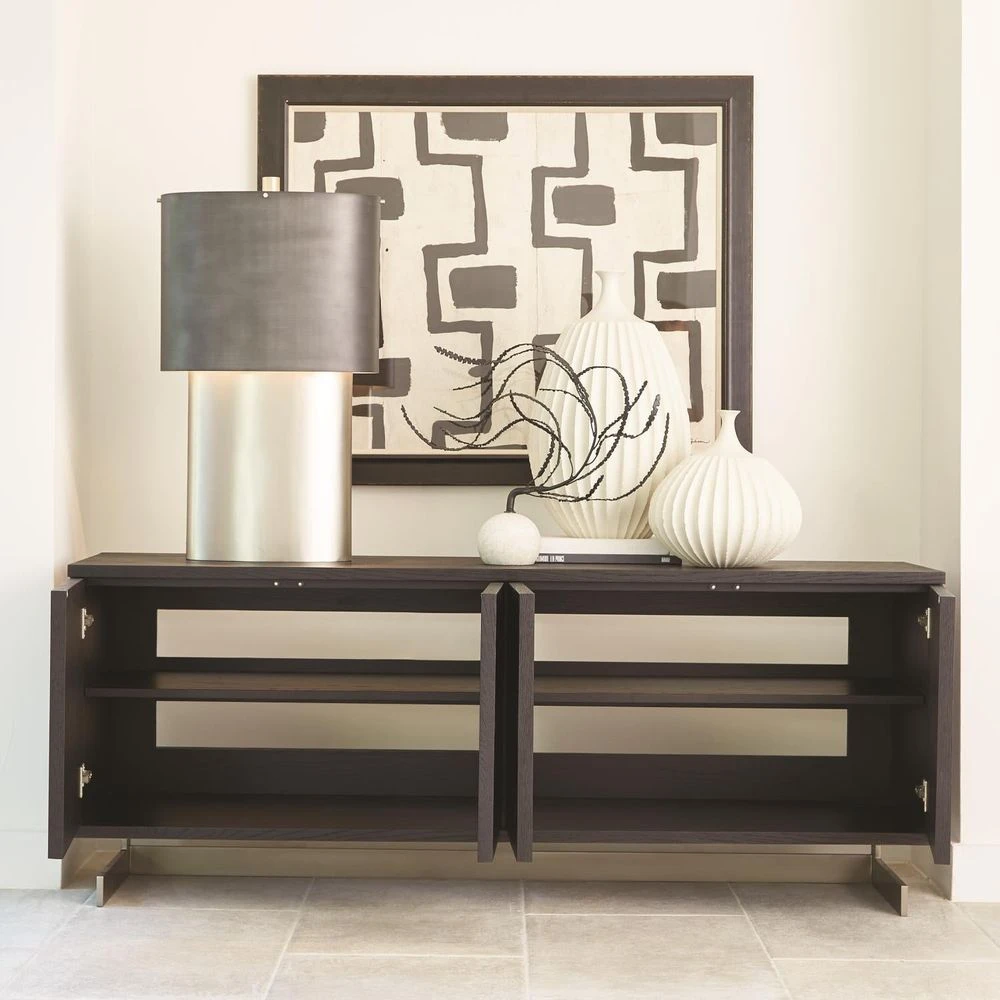 The Cantilevered Star Media Cabinet is a stunning example of fine furniture craftsmanship. Each door panel is precisely veneered in crown cut Oak with a raised star pattern and finished with a wire brushed black stain. The cantilevered base is constructed of stainless steel with a brushed satin nickel finish. Media connectivity can be easily done through the slat back which also provides ventilation. 1 adjustable shelf per compartment.