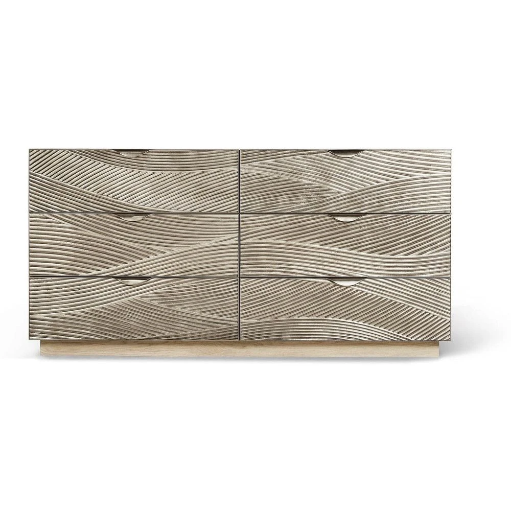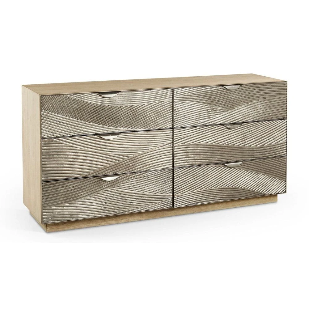 The Capillary cast metal texture double dresser from Jonathan Charles’ Water portfolio features sculptural metal drawer fronts with a hand carved wave motif in satin white brass that shimmers against a bleached oak case. Understated functional elements such as masterfully shaped stainless steel pulls custom cast in Jonathan Charles’ foundry and a recessed hardwood pedestal blend seamlessly into Capillary’s alluring forms.