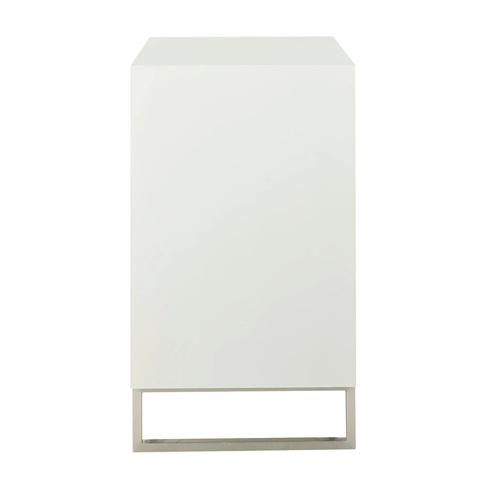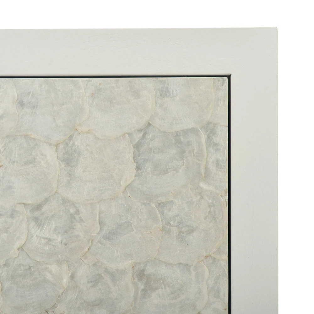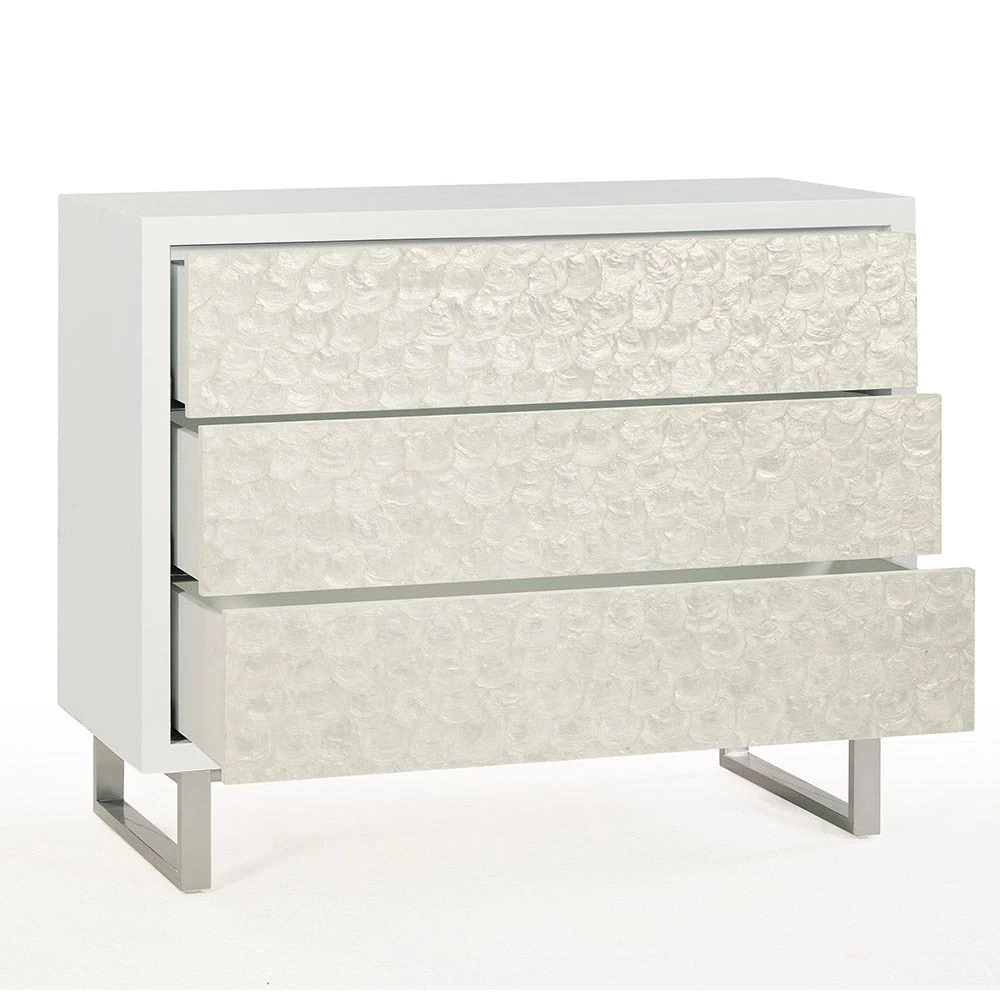Description: Our Capiz Chest features a smooth top and shape, three soft-close storage drawers with push/pull hardware, and an aluminum base; Ghost finish on Acacia crown veneer and solids.