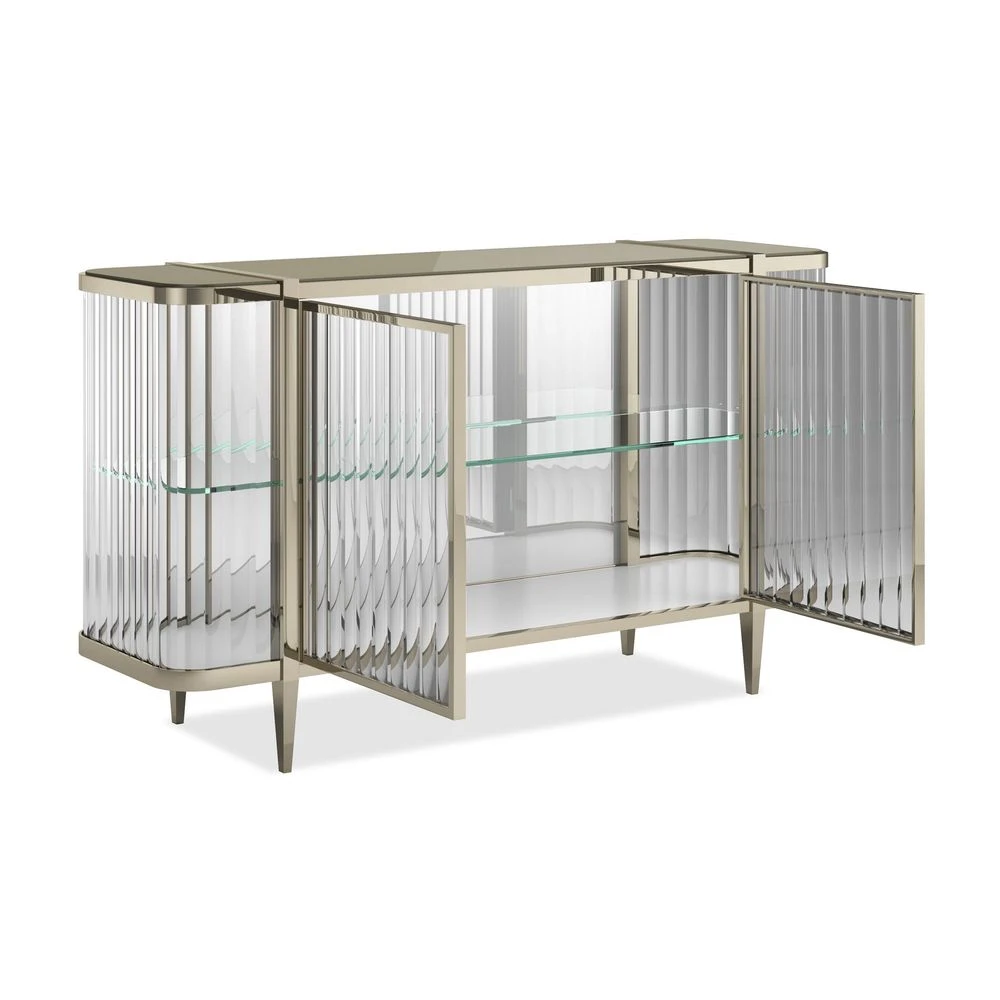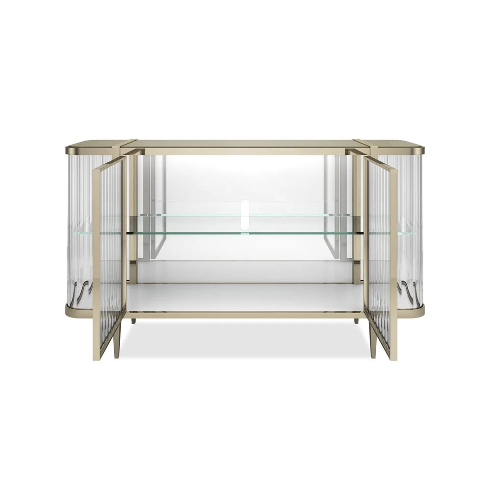 It’s true, this console is so extraordinary, you can’t help but Stop And Stare. It’s an instant source of brightness and reflectivity that creates a natural focal point. A wavy acrylic exterior mirrors the undulating patterns of sand and sea while its top adds another layer of organic splendor. The mirrored interior back and bottom panels are designed to reflect light as it pours in from every angle as well as mirror the beauty of the treasures you display. Glass shelves ensure unobstructed views as do its touch-latch doors with concealed hinges. A Whisper of Gold finish outlines its rounded silhouette and four tapered feet, imparting the overall luxe feeling of a diamond in a platinum setting.