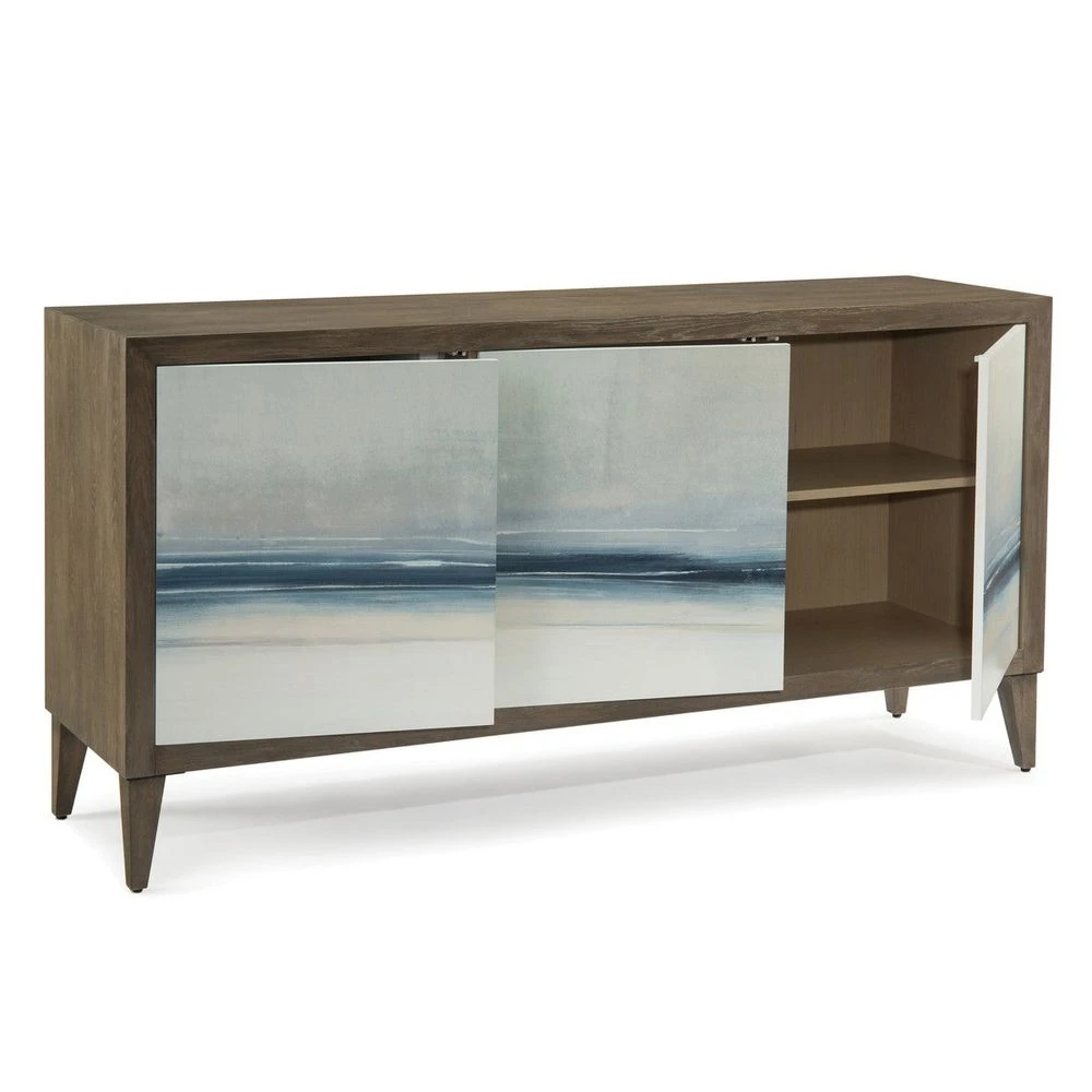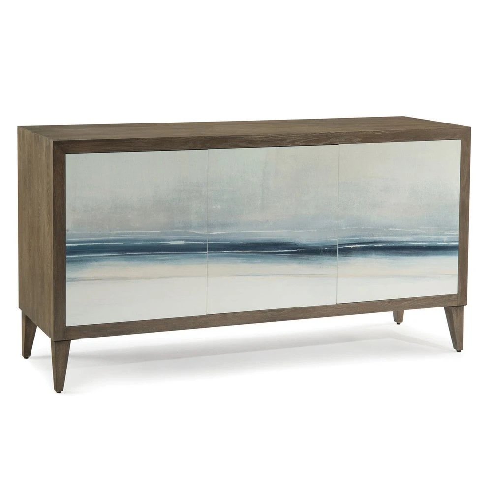 Description: This three-door credenza in flat oak veneer is finished in driftwood and has solid oak feet. The front of this piece is printed with a reproduction of Ellsworth Benson-Cobb’s painting Enigma.